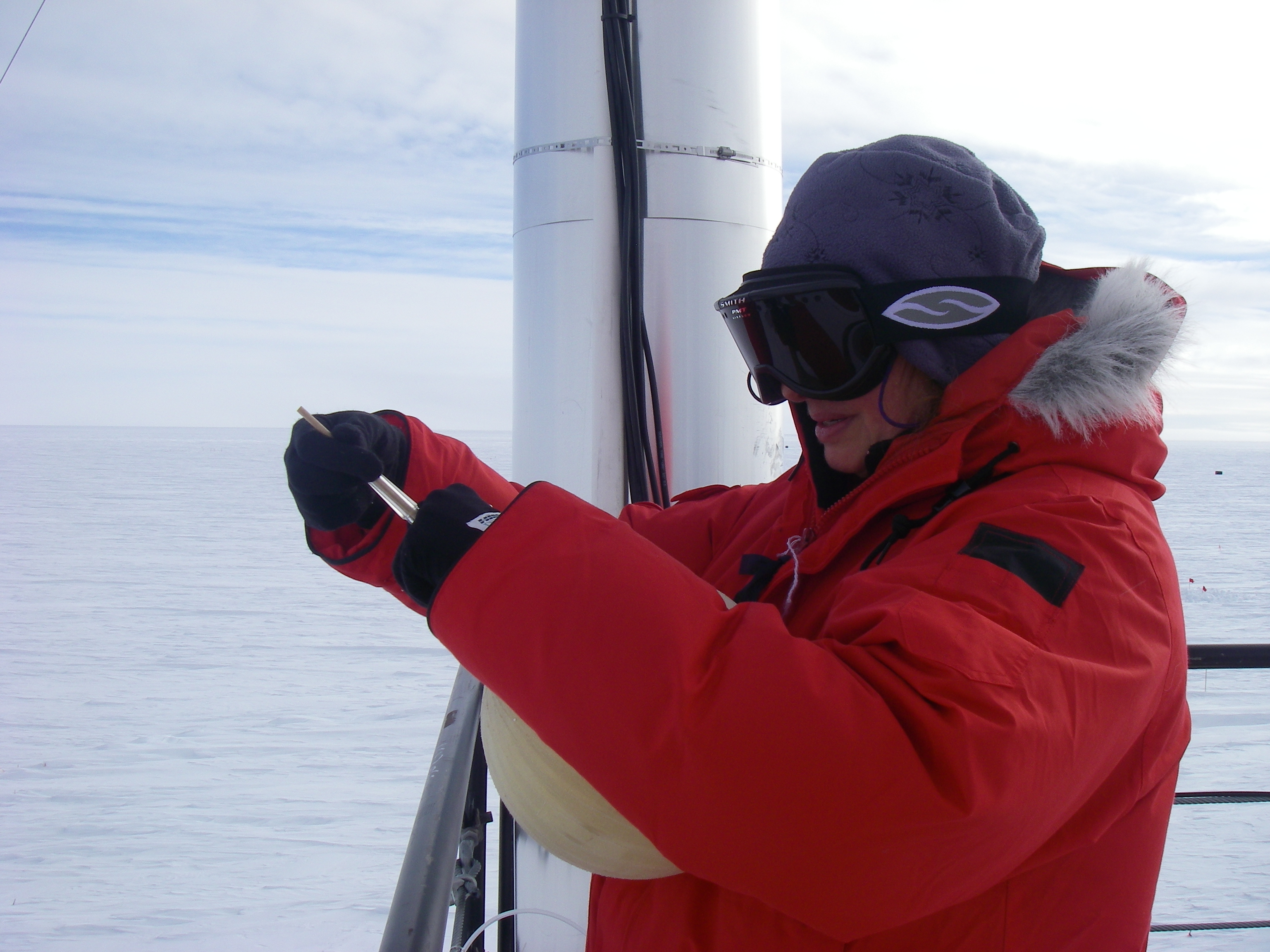 Elke Bergholz on the roof of the Atmospheric research Observatory filling bottles with air for a laboratory in California. NOAA is helping out other laboratories and is collecting and shipping air from the South Pole for their research. This air is used as the control for the world. On the roof of the Atmospheric Research Observatory (ARO), a quarter of a mile away from the main building of the Amundsen-Scott South Pole Station, Antarctica.