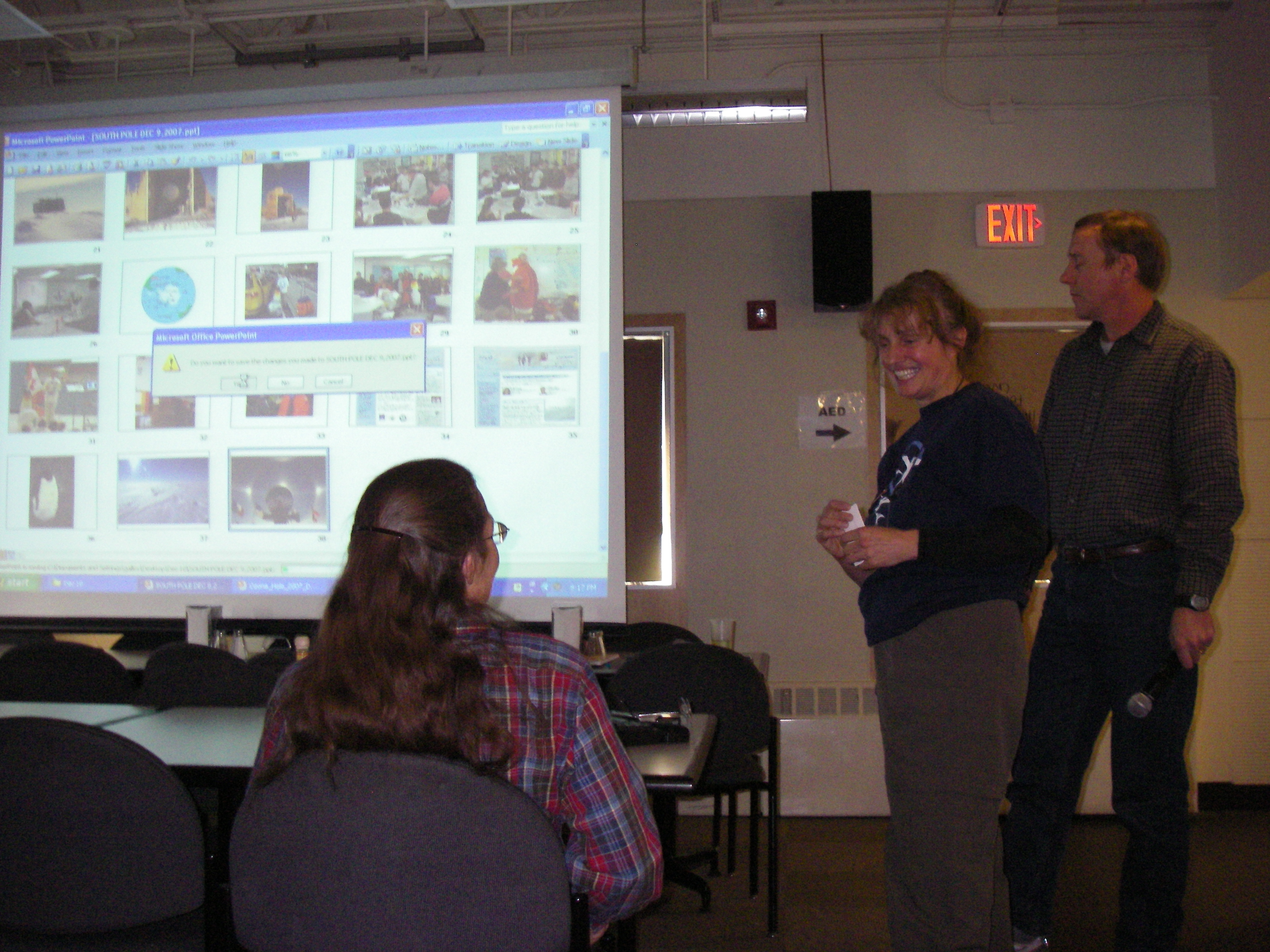 Elke Bergholz answering questions after her PolarTREC presentation during the Sunday night science lecture, at the dining hall of new elevated Amundsen-Scott South Pole Station, Antarctica.