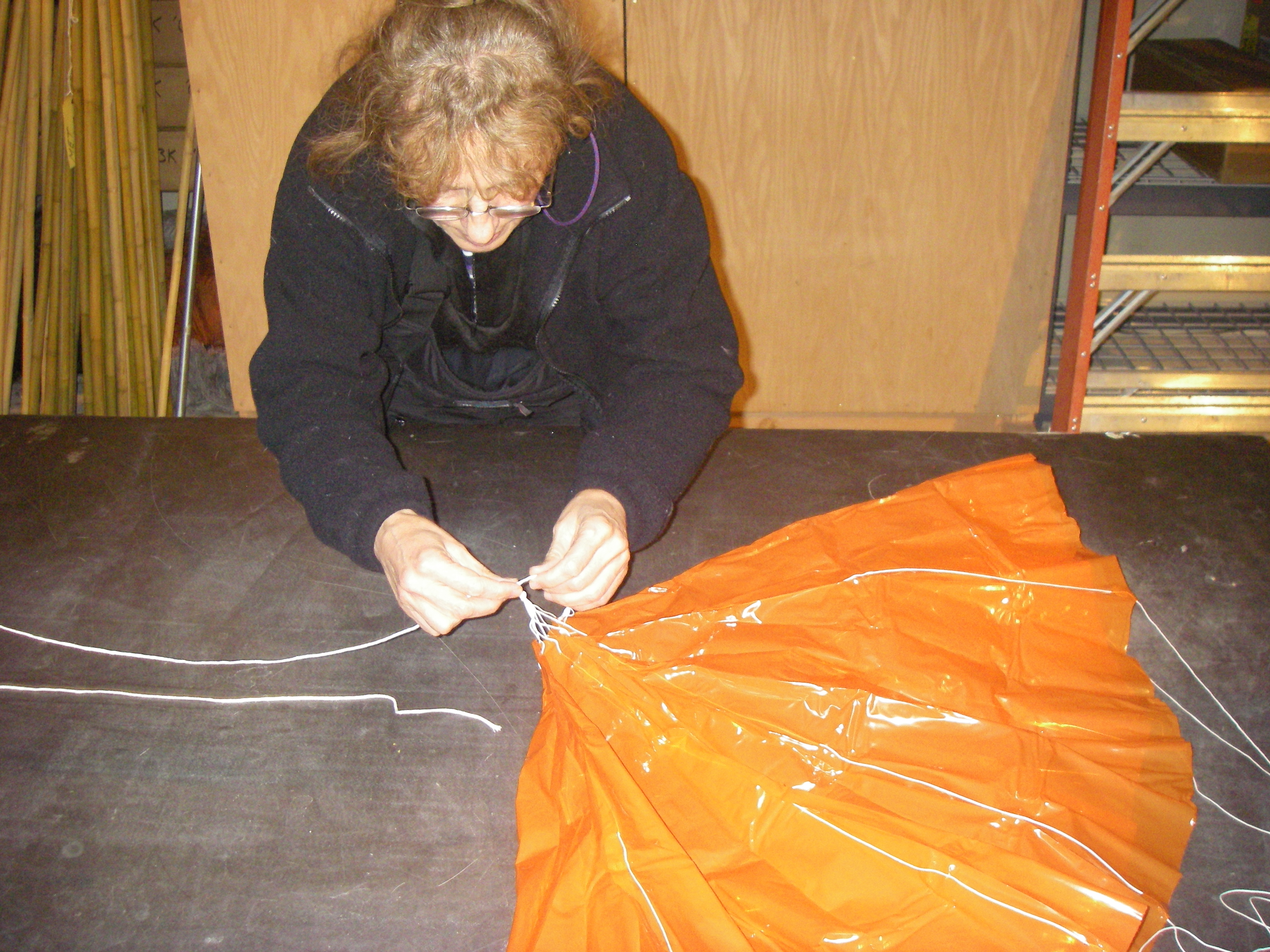Elke is attaching the parachute to the balloon. Inside the Balloon Inflation Facility (BIF) at the Amundsen-Scott South Pole Station, Antarctica.
