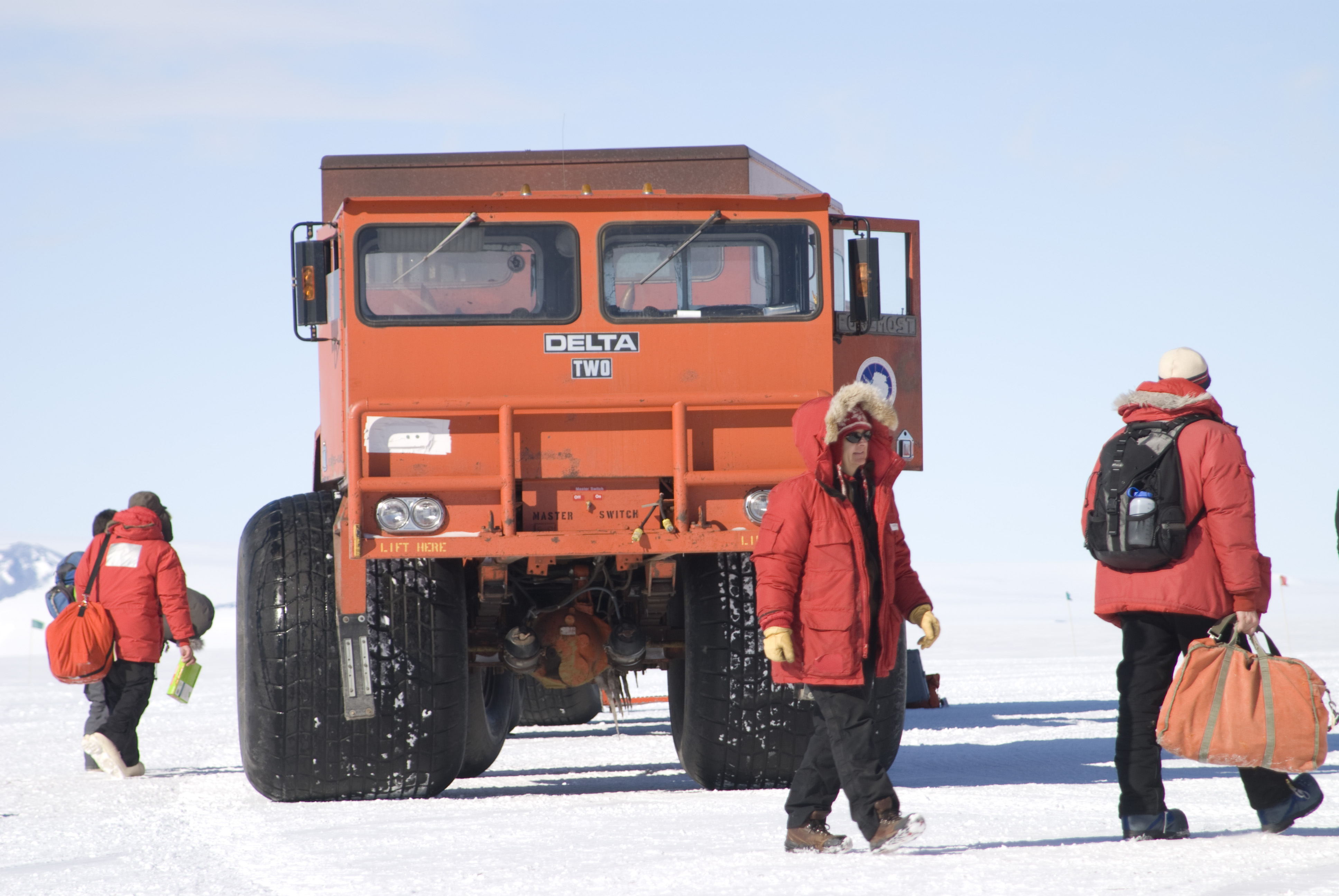 The Delta transport vehicle delivers people to the Pegasus Field to catch the C17 for the flight back to Christchurch, New Zealand. Pegasus Field, near McMurdo Station, Antarctica.