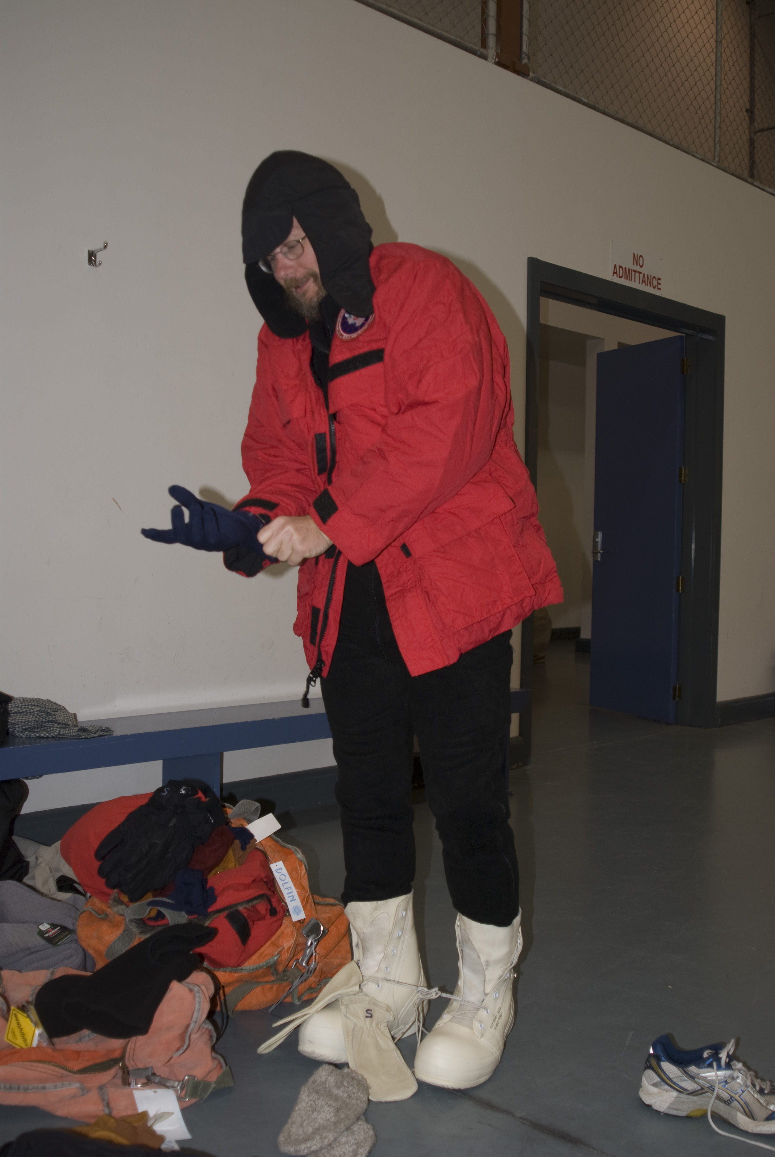 Kirk putting on bunny boots and other ECW (extreme cold weather) gear. Christchurch, New Zealand.