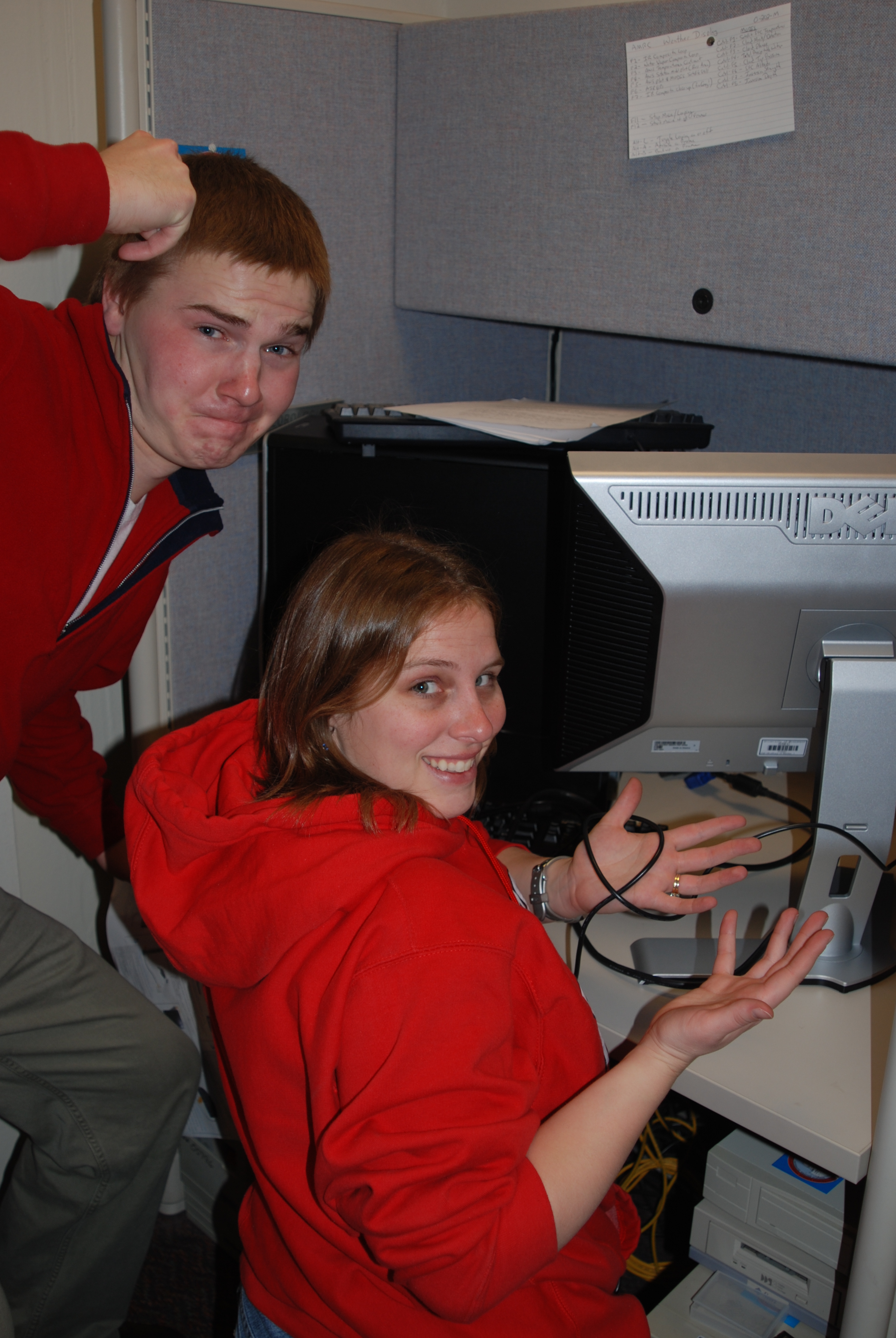 Shelley Knuth and Jonas Asuma at work hooking up a new computer. McMurdo Station, Antarctica.