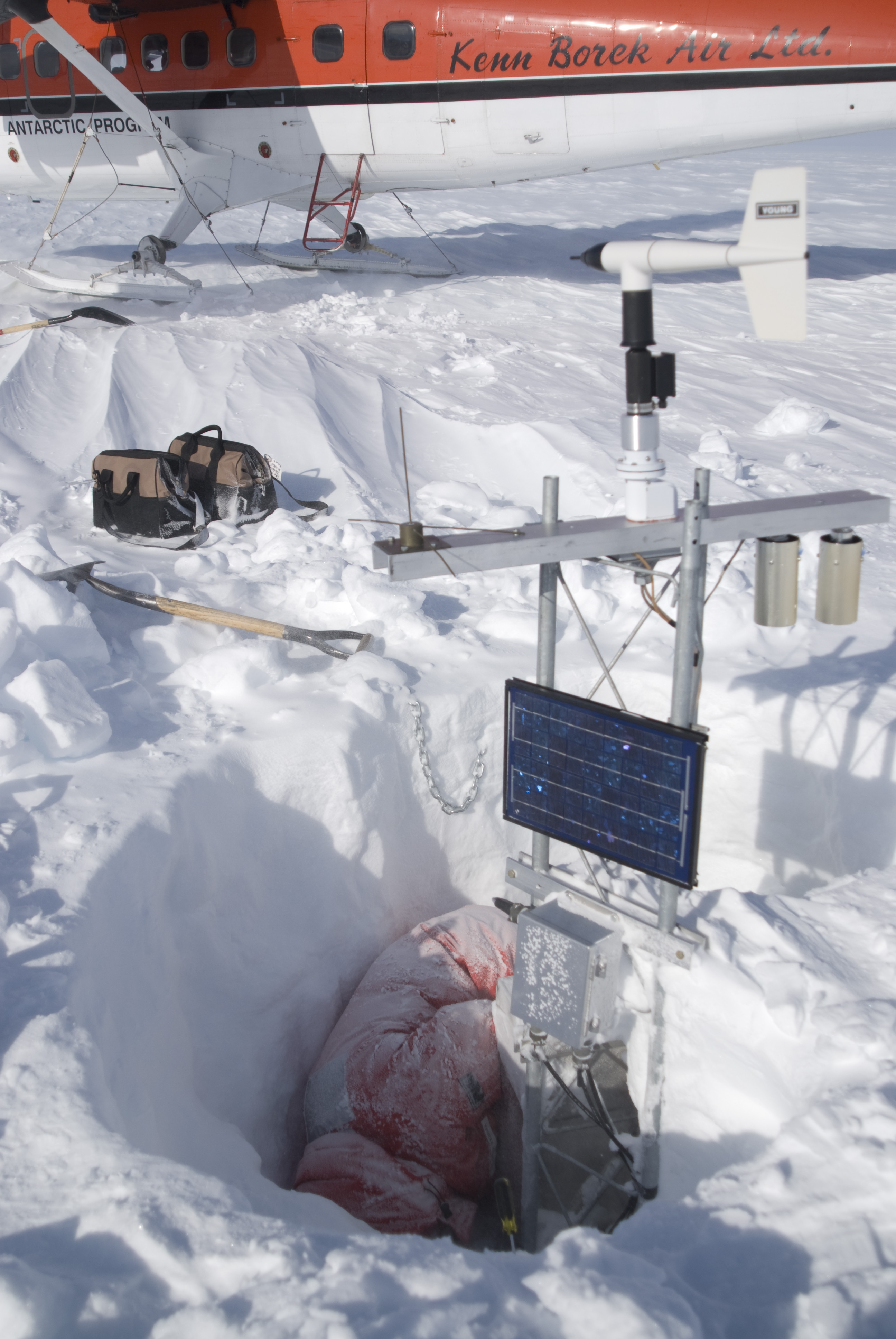 George Weidner, of University of Wisconsin - Madison, works in the field on a snow-buried weather station. Teresa Weather Station, West Antarctica.