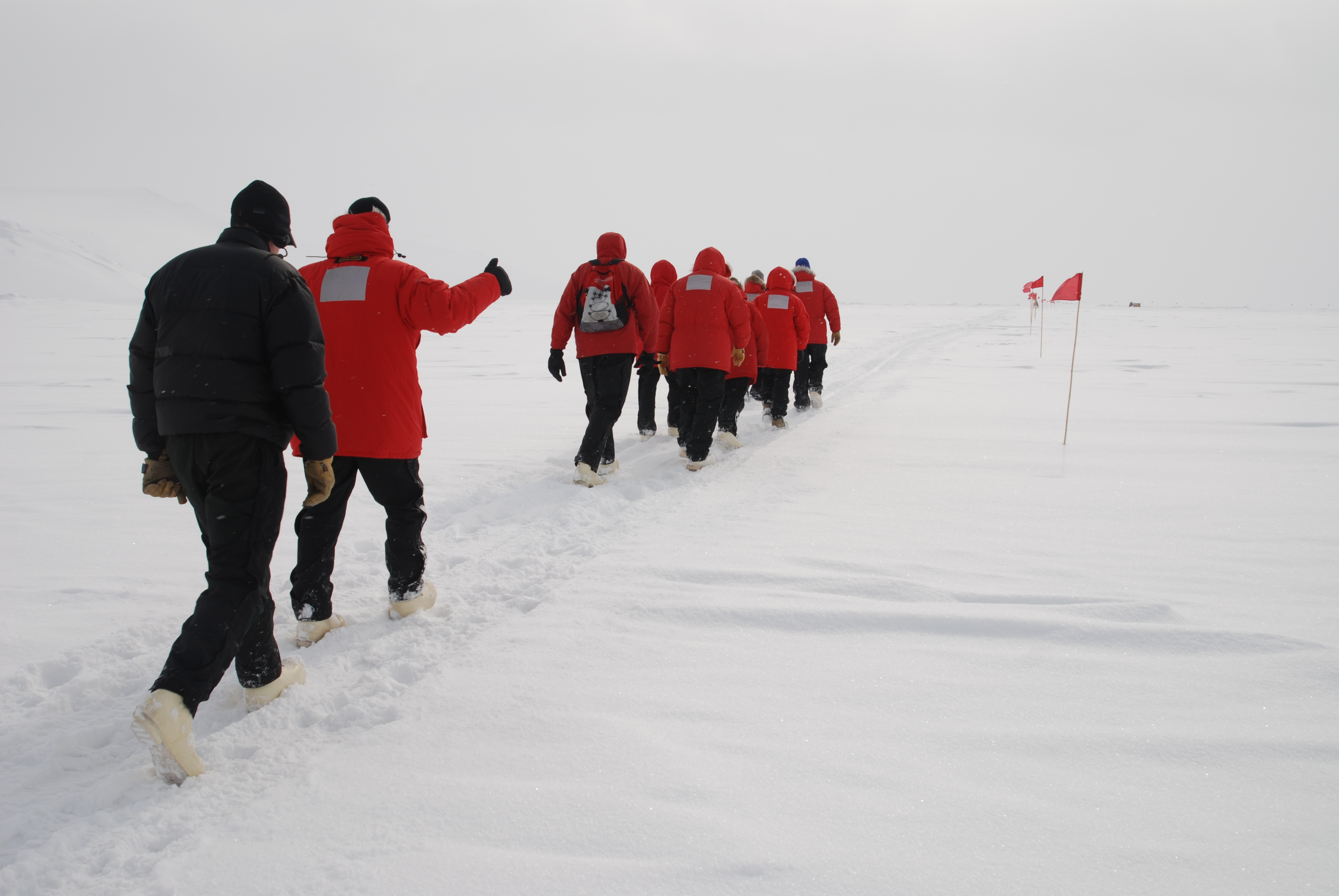 Campers walking to Happy Camper School on the McMurdo Ice Shelf. Happy Camper School, near McMurdo Station, Antarctica.