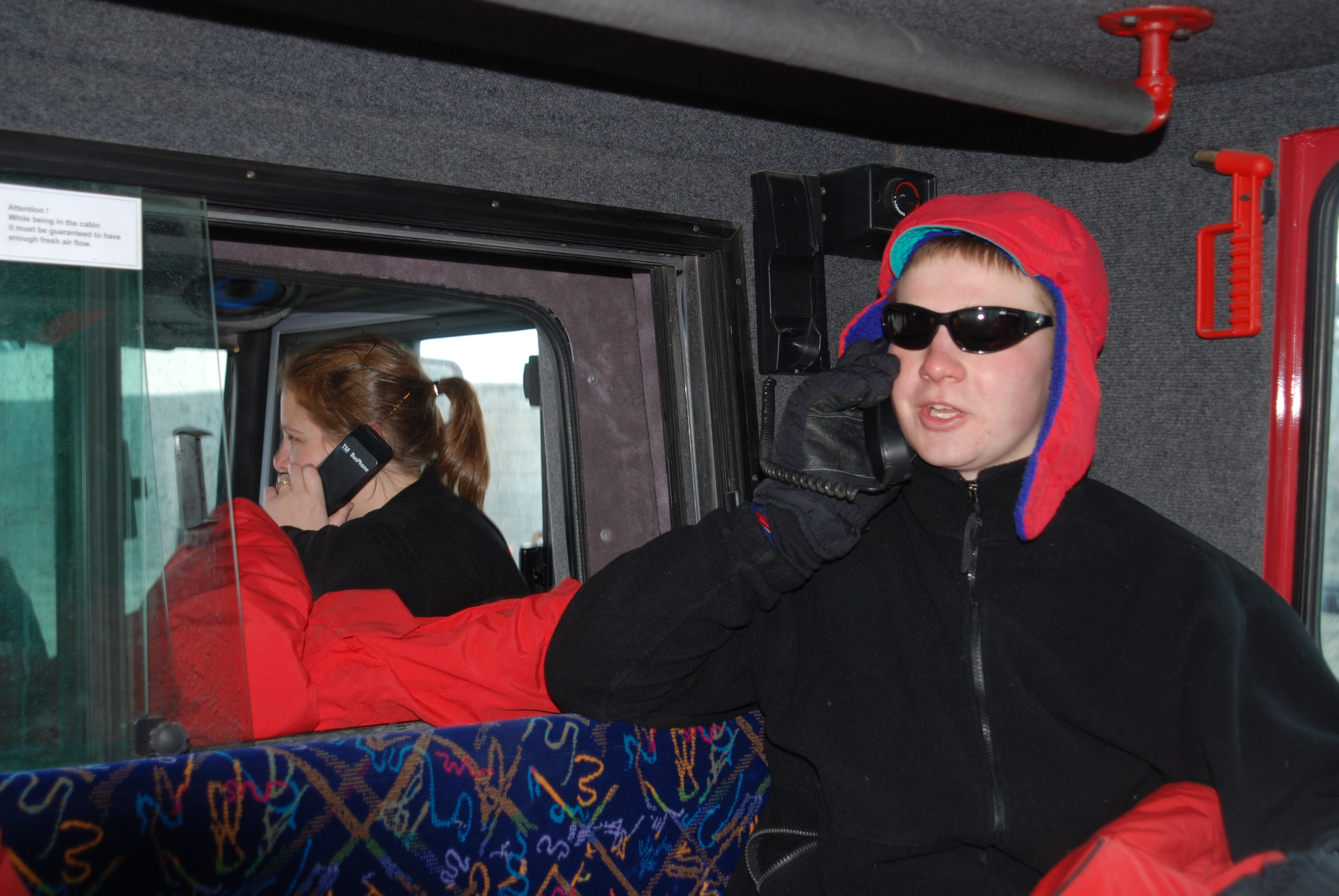 Jonas Asuma and Shelley Knuth on the phone in the Piston Bully on the way to Windless Bight, Antarctica.