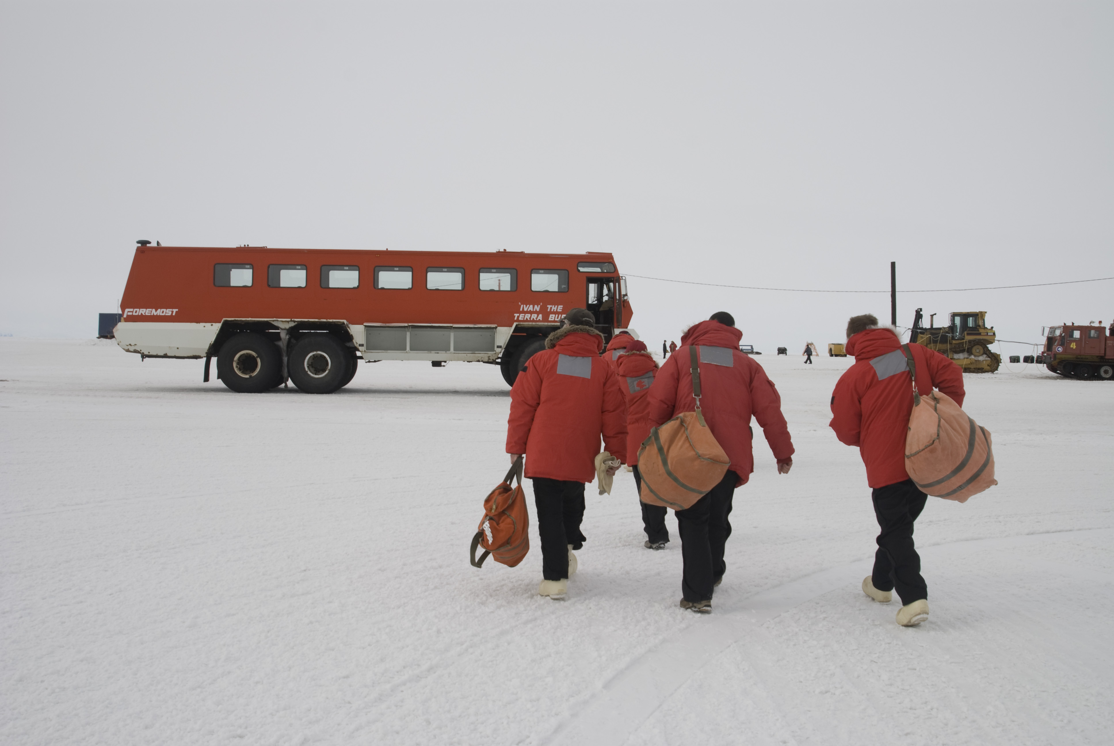 Passengers just arriving from Christchurch, New Zealand carry their bags across the ice shelf to Ivan The Terra Bus. Pegasus Field, near McMurdo Station, Antarctica.
