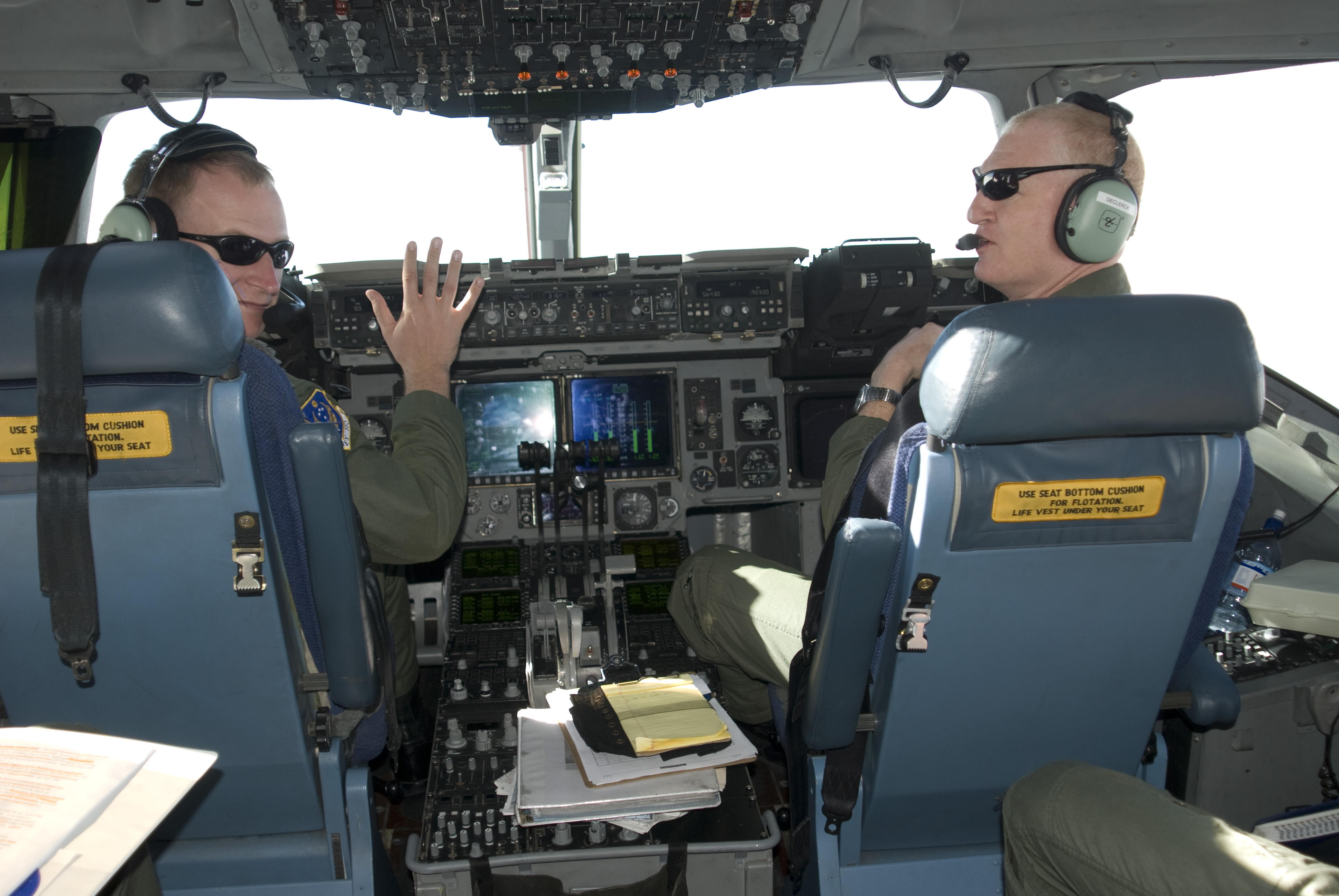 Pilots in the cockpit of the C17 during the flight from McMurdo Station to Christchurch, New Zealand.