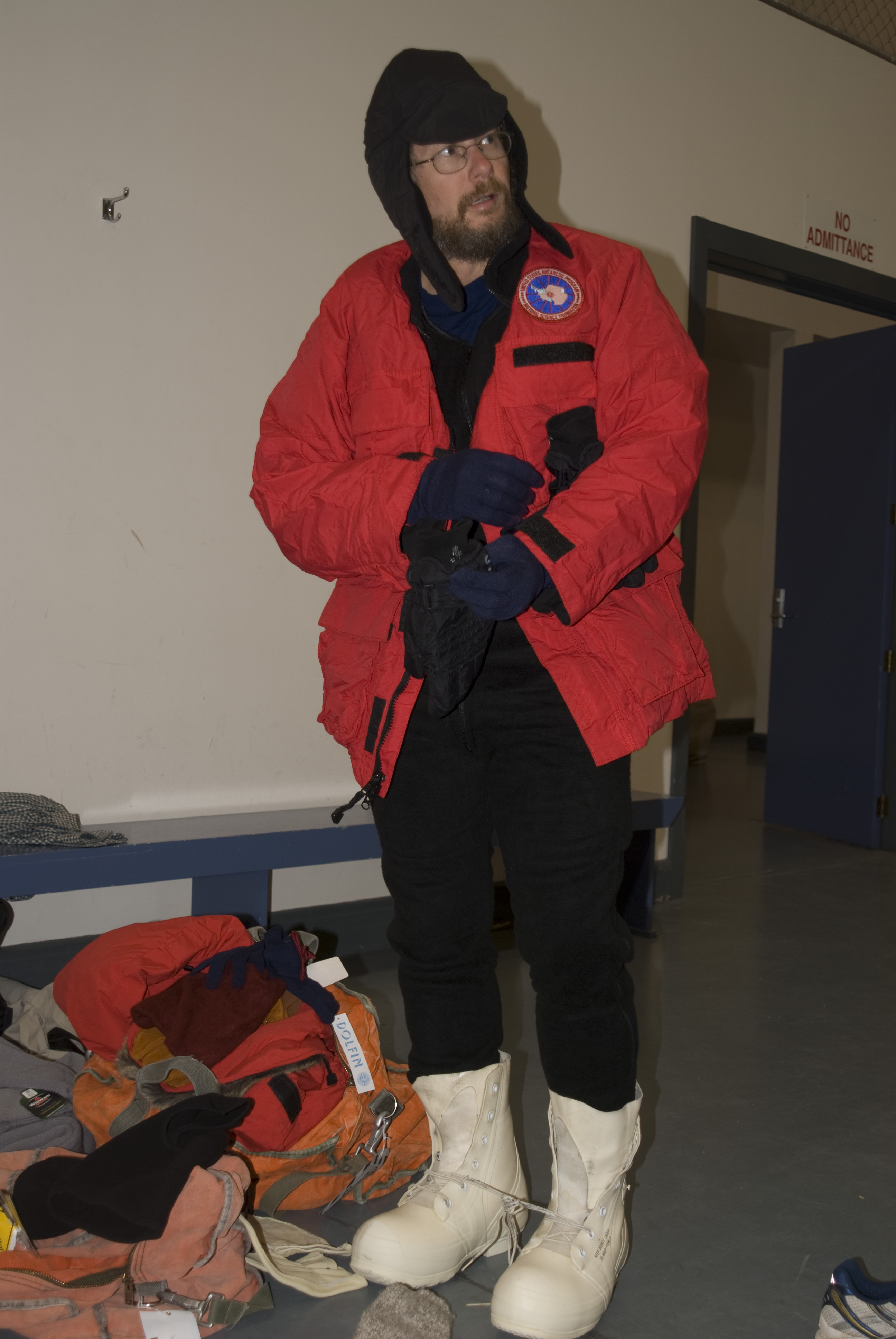 Kirk putting on bunny boots and other ECW (extreme cold weather) gear. Christchurch, New Zealand.