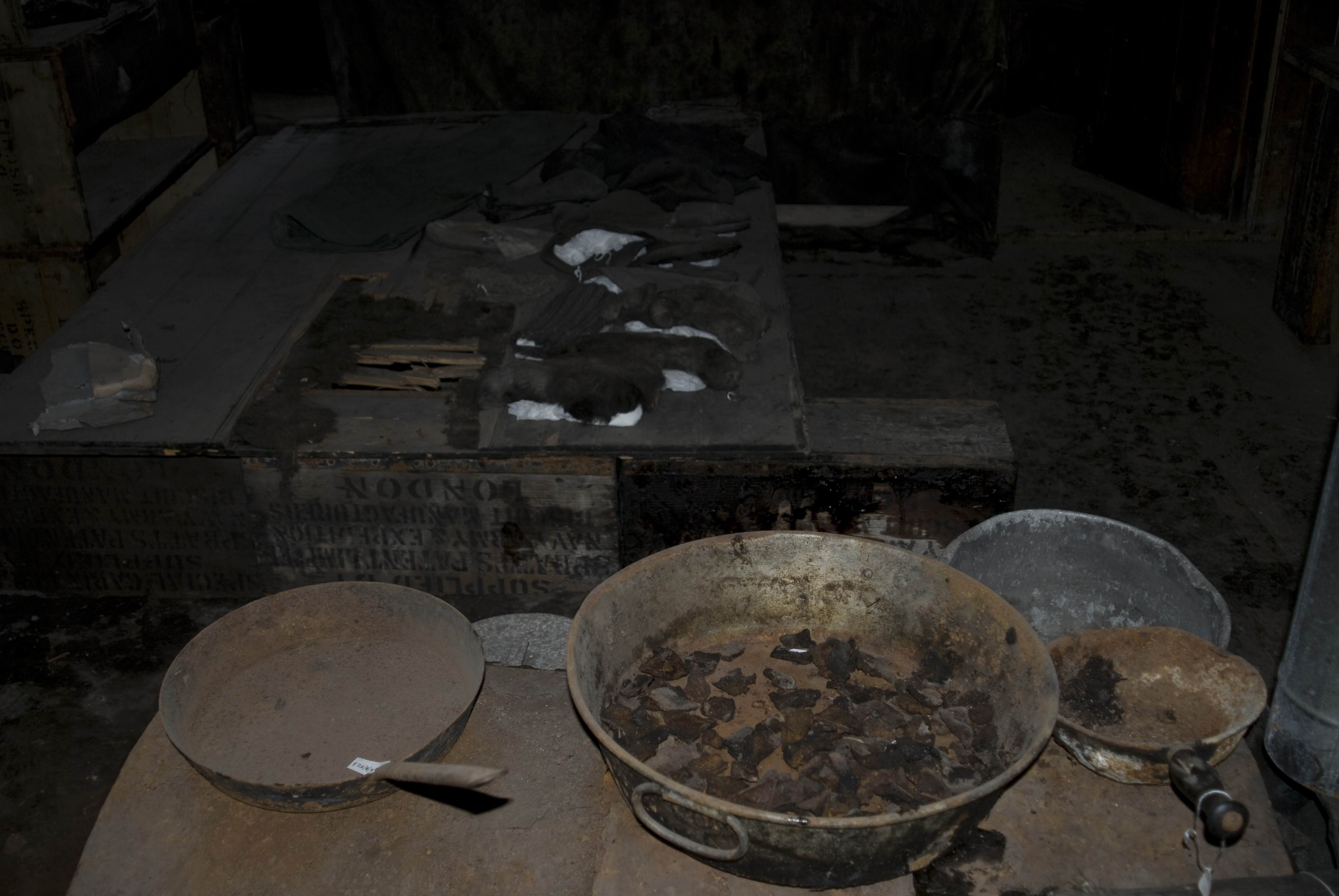 Dishes still containing food inside Scott's Discovery Hut, at Hut Point on Ross Island, Antarctica.