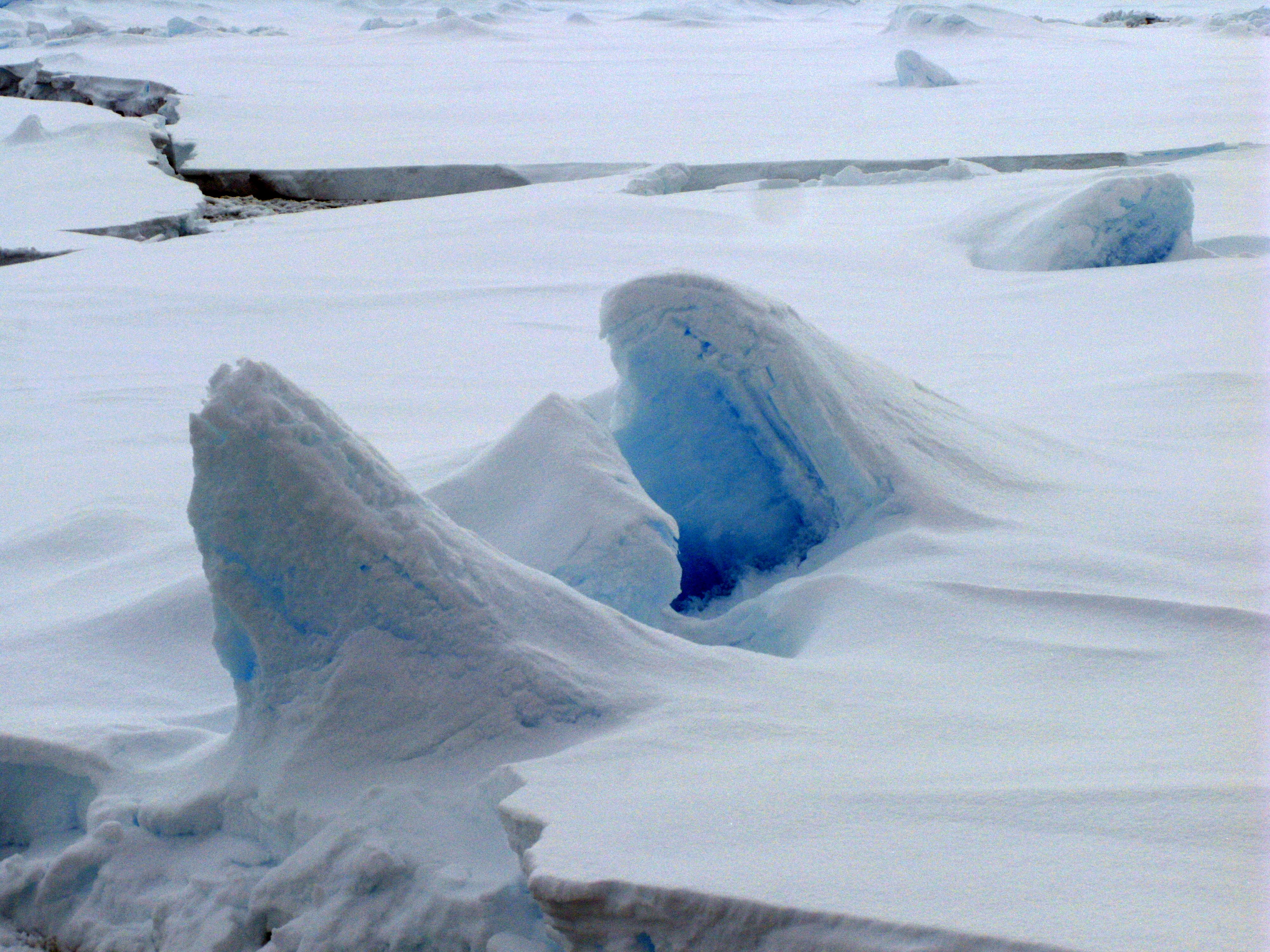 Pointed peaks of blue ice. Aboard the icebreaker Oden in the Bellingshausen Sea.