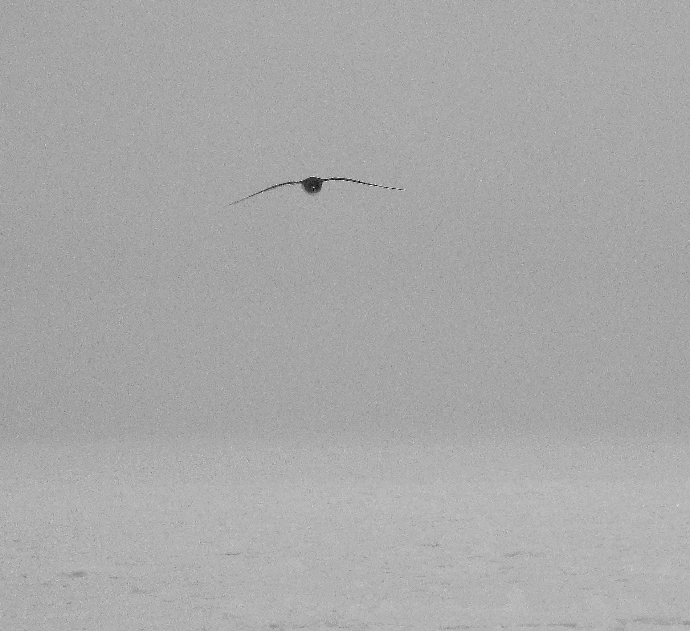 A solitary bird flies toward the Oden in a snowstorm. Aboard the icebreaker Oden in the Bellingshausen Sea.