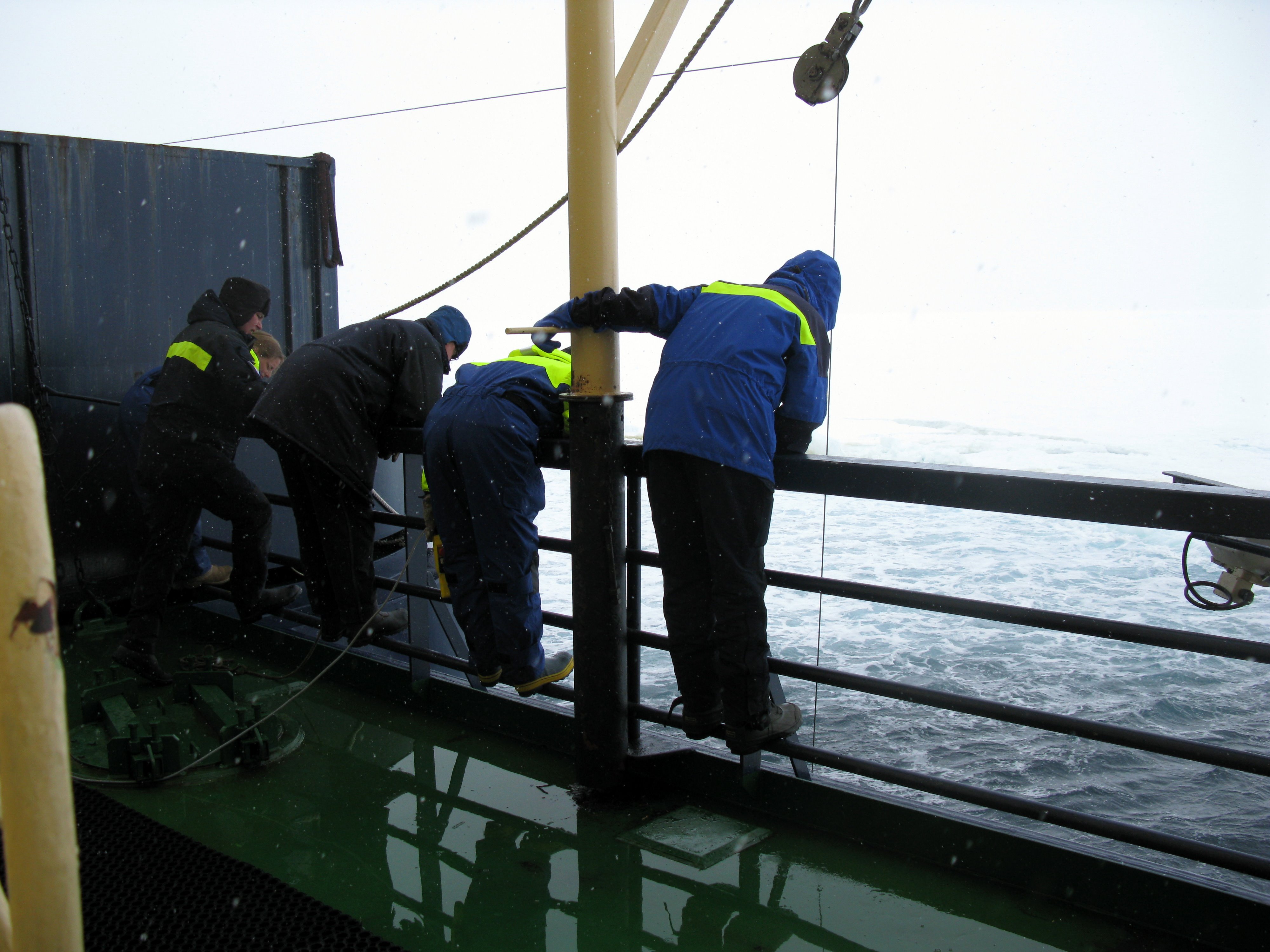 All eyes are on the plankton tow net as it is lowered. Aboard the icebreaker Oden in the Amundsen Sea.