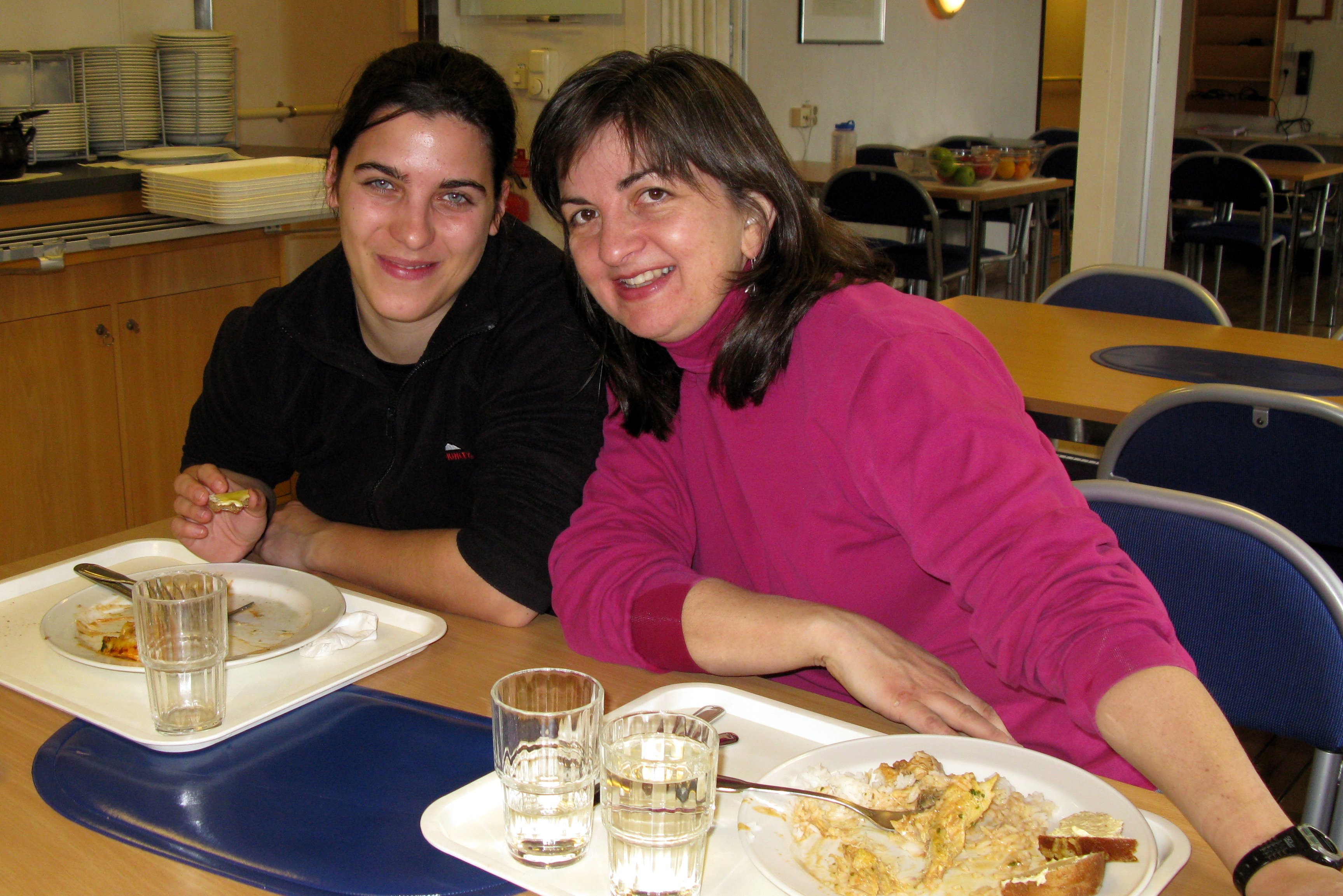 Grad student Friederike Heinrich and PI Tish Yager enjoy a good meal and camaraderie in the mess hall. Aboard the icebreaker Oden in the Amundsen Sea.