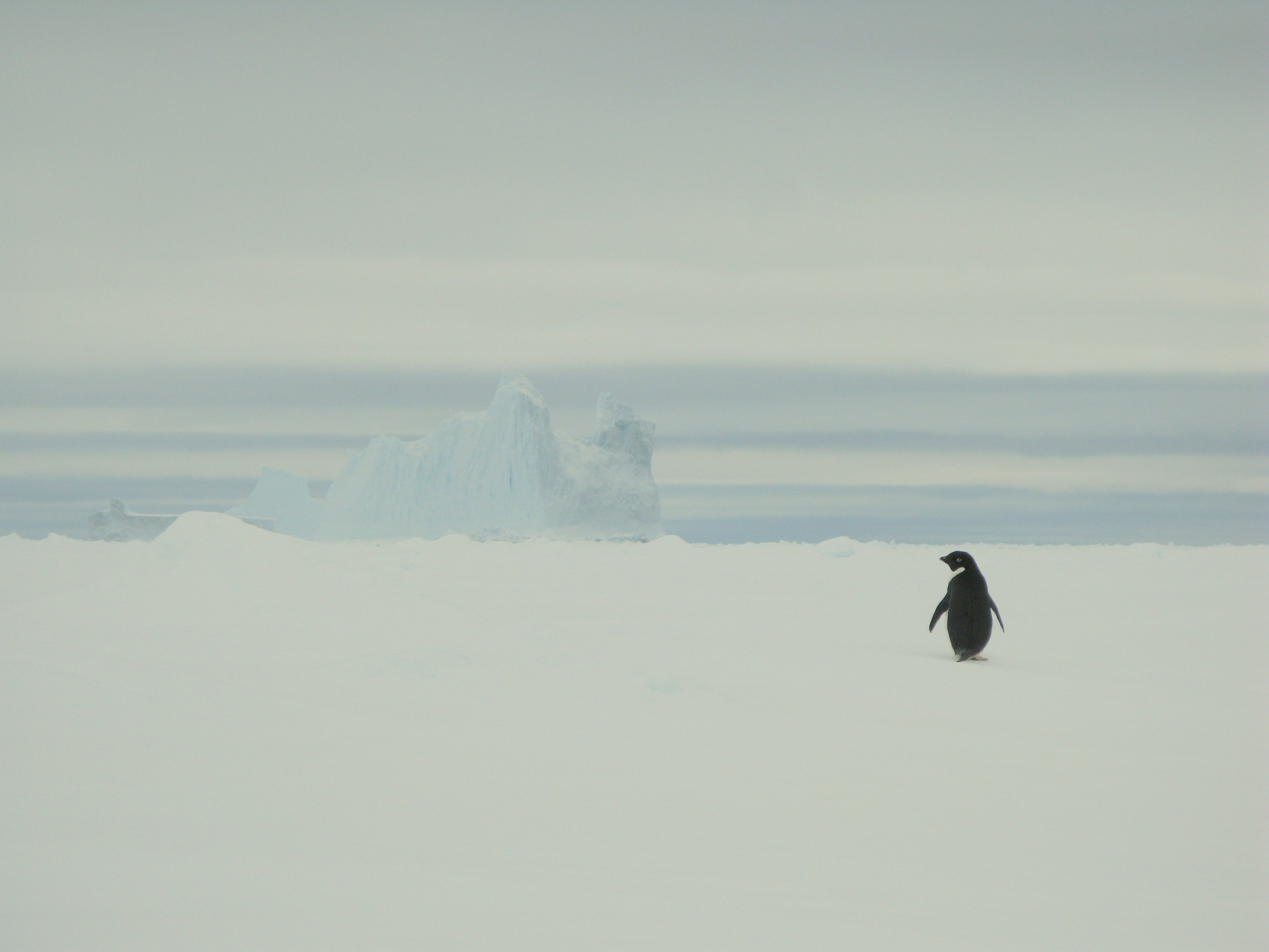 An iceberg and an Adélie penguin. On the sea ice near the icebreaker Oden near the Getz Ice shelf, Amundsen Sea.