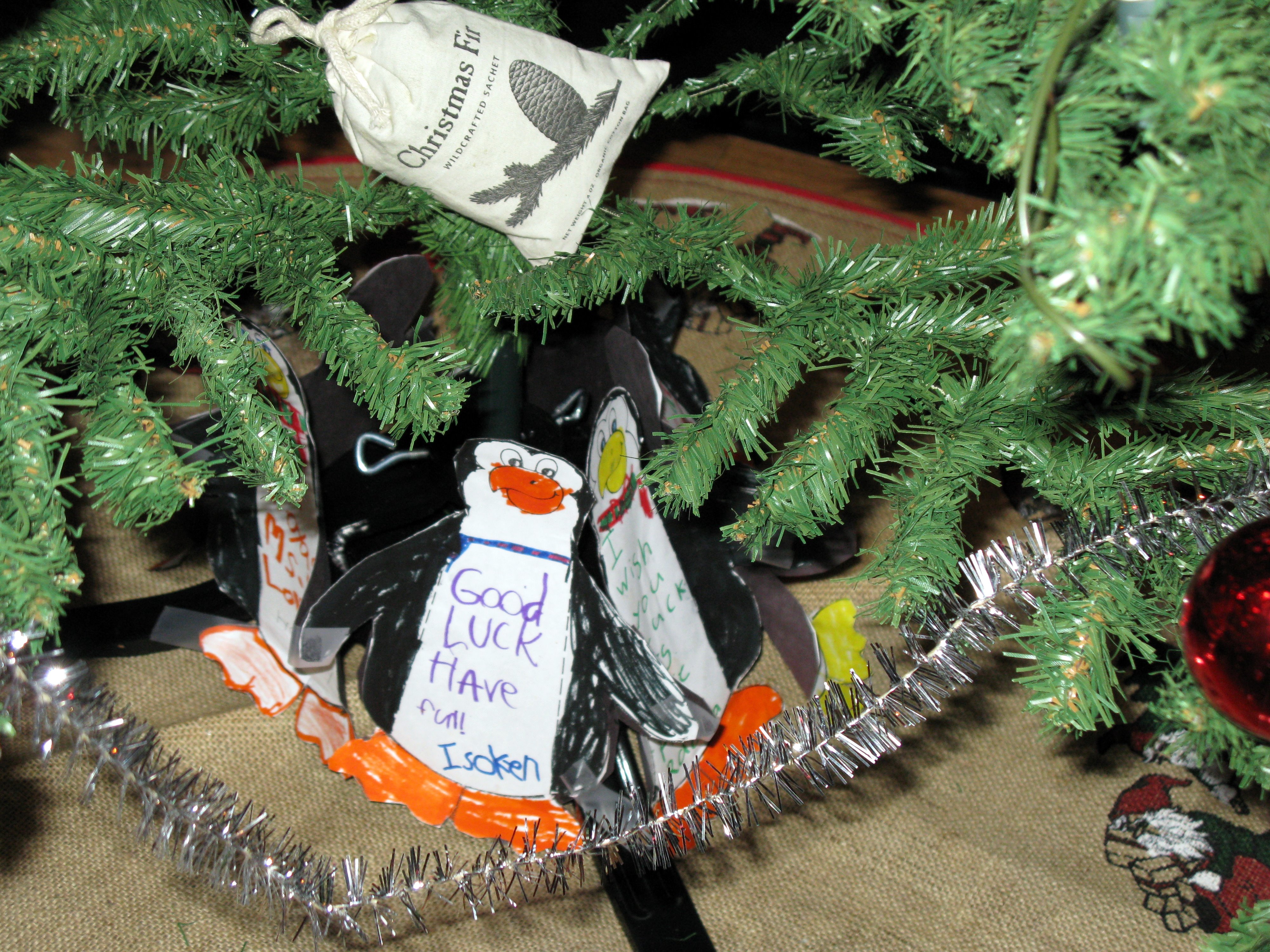 Penguins made by 1st grade Redd School students hang prominently on the tree. Aboard the icebreaker Oden between the Amundsen Sea and the Ross Sea.