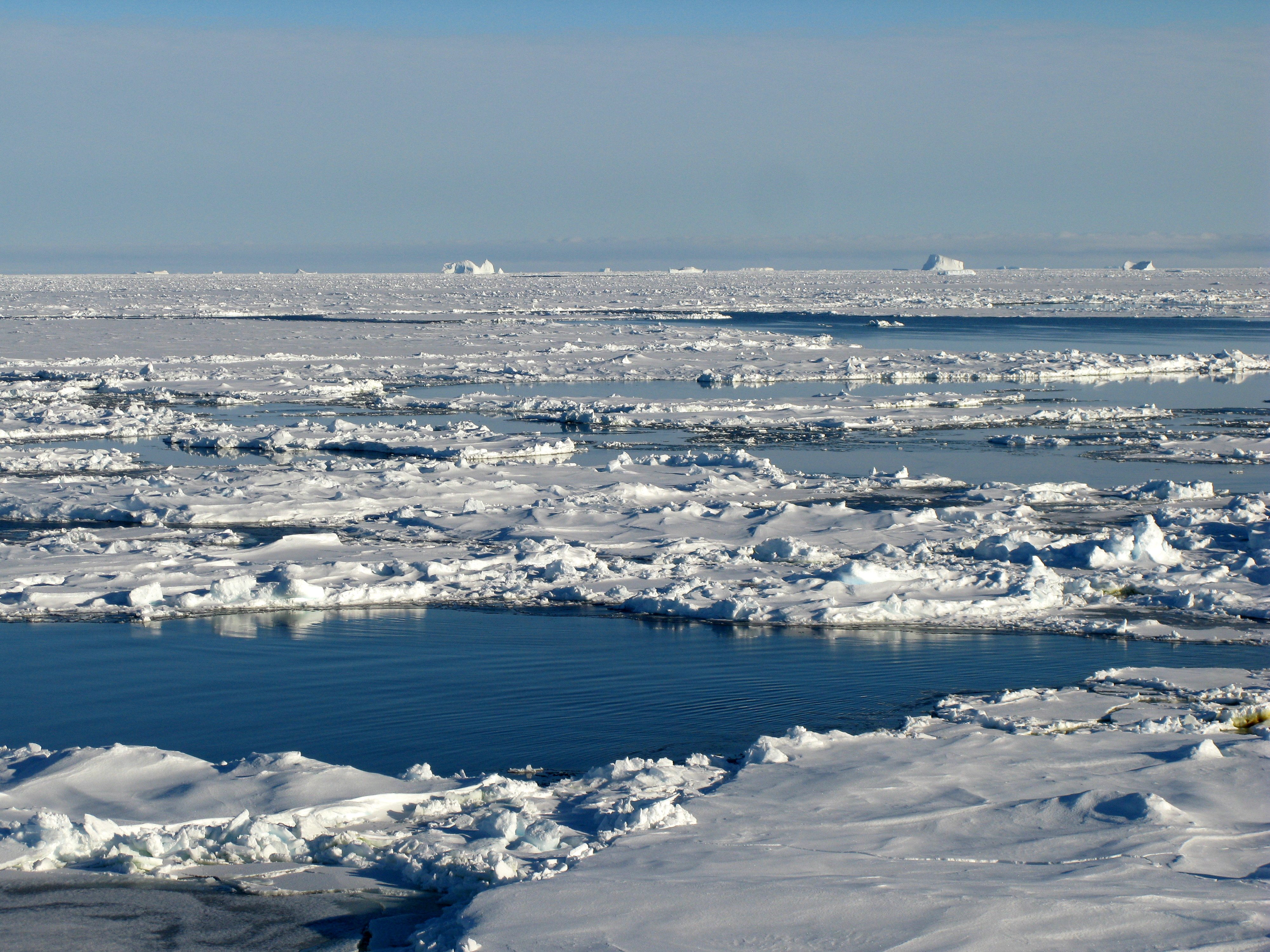 Blue skies mirrored in the sea between consolidated ice floes. Aboard the icebreaker Oden between the Amundsen Sea and the Ross Sea.