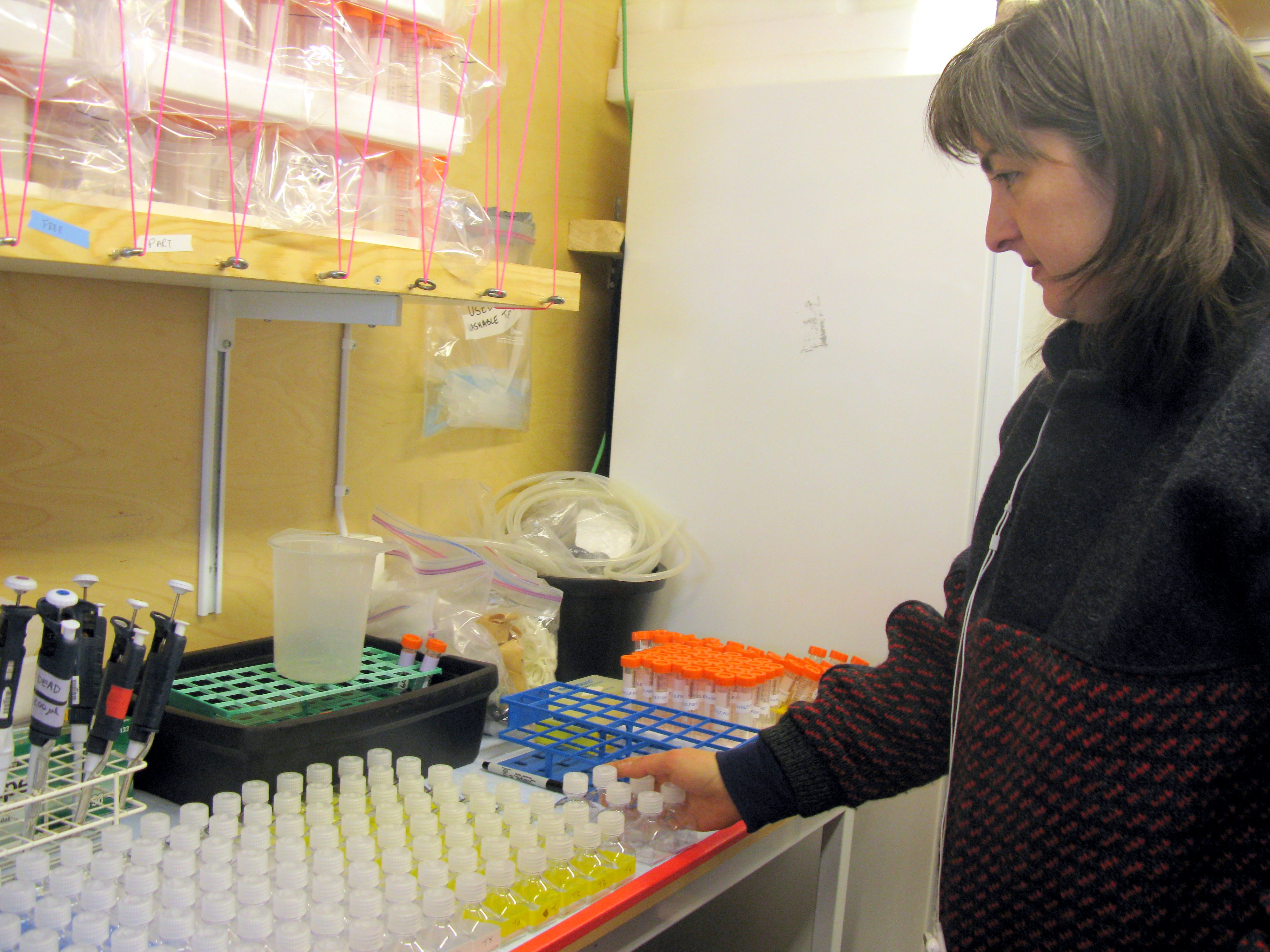 Researcher Tish Yager is pensive as she prepares bottles for water sampling in the lab. Aboard the icebreaker Oden near the Dotson Ice shelf, Amundsen Sea.