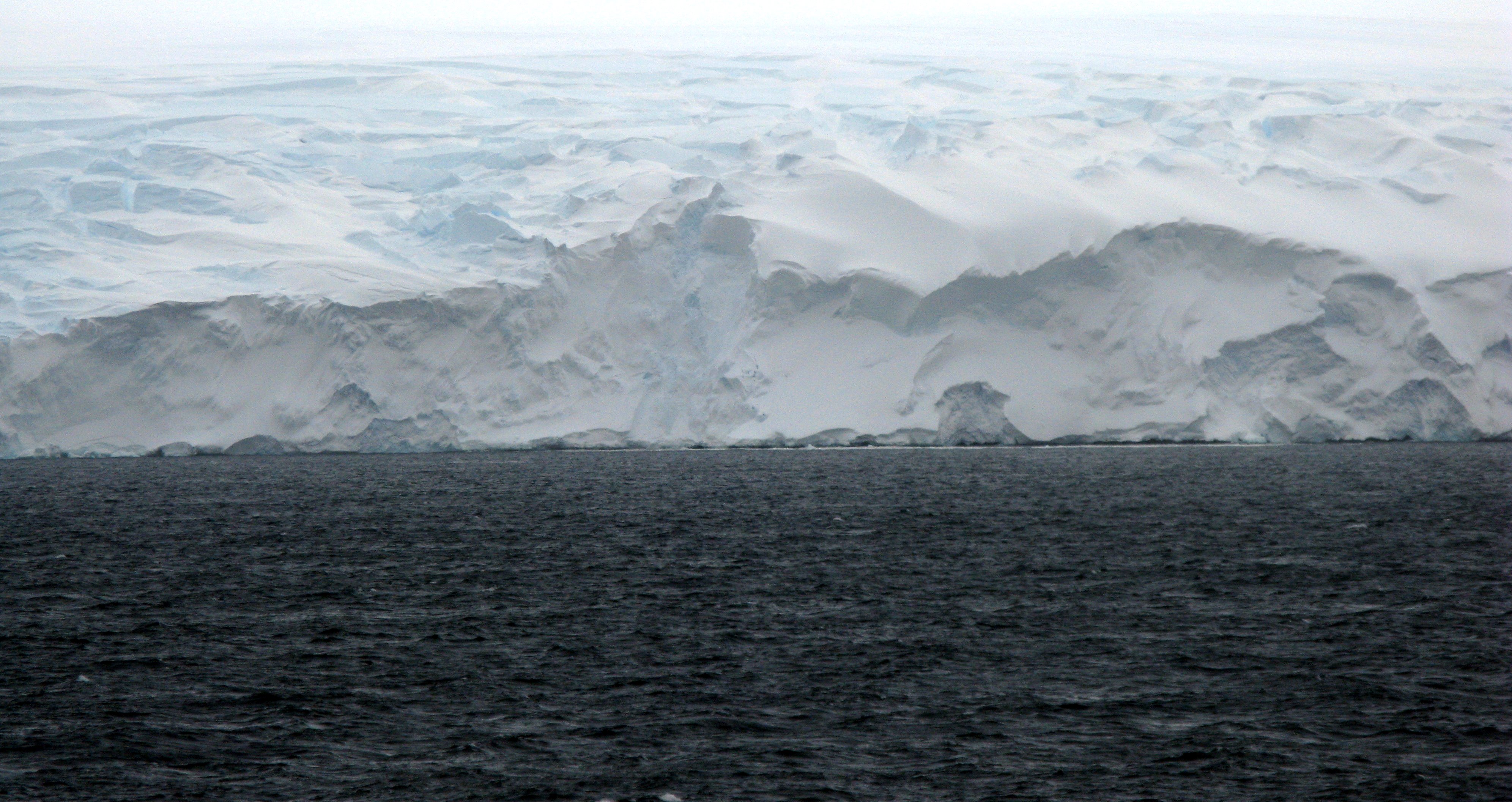 A massive wall of ice borders a polynya (an area of open water surrounded by sea ice). Aboard the icebreaker Oden in the Amundsen Sea.