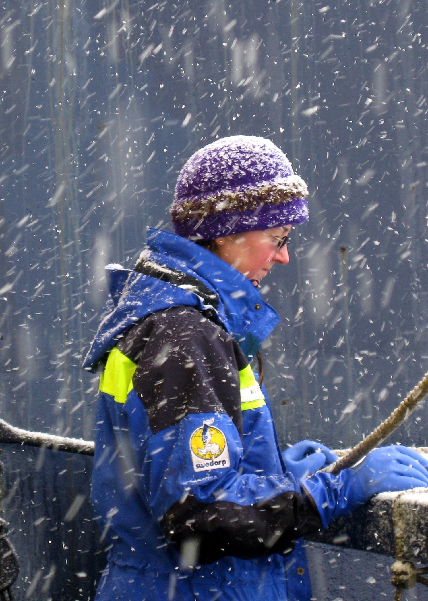 Researcher Rebecca Dickhut is covered in ice and snow as she watches the plankton net lowered. Aboard the icebreaker Oden near the Getz Ice shelf, Amundsen Sea.