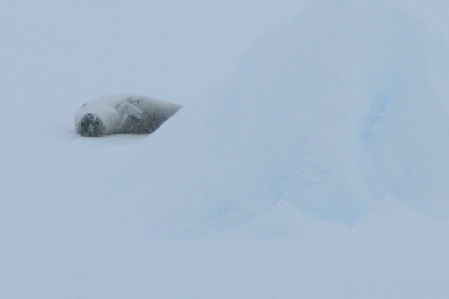 A seal lounges lazily in the middle of a snowstorm. Aboard the icebreaker Oden near the Getz Ice shelf, Amundsen Sea.