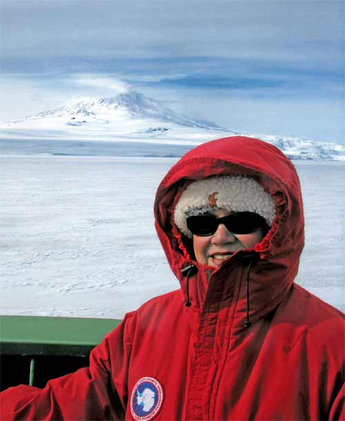 Lollie Garay on the Oden with Mt. Erebus in the background. Aboard the icebreaker Oden in the Amundsen Sea near the Getz Ice Shelf.