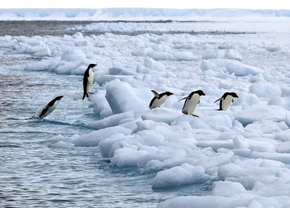 Adélie Penguins jump onto the ice one after another at the frozen Bay of Whales in the Ross Sea.