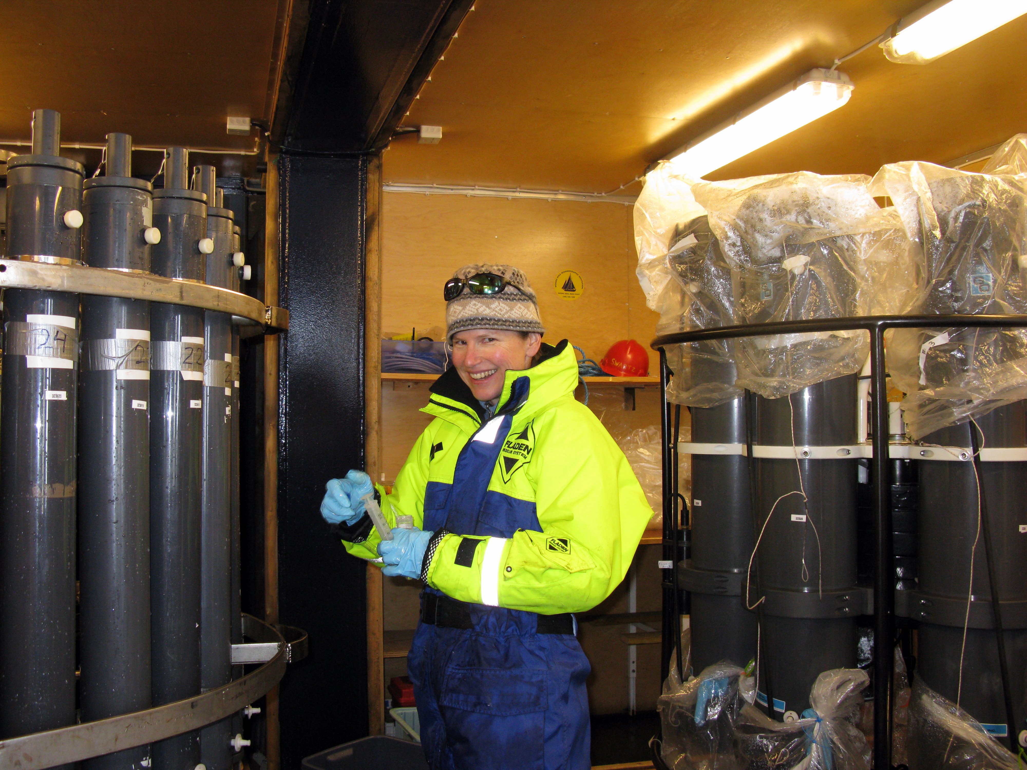 Researcher Sharon Stammerjohn prepares to take water samples from the CTD (a conductivity, temperature, and depth sensor). Aboard the icebreaker Oden near the Amundsen Sea.