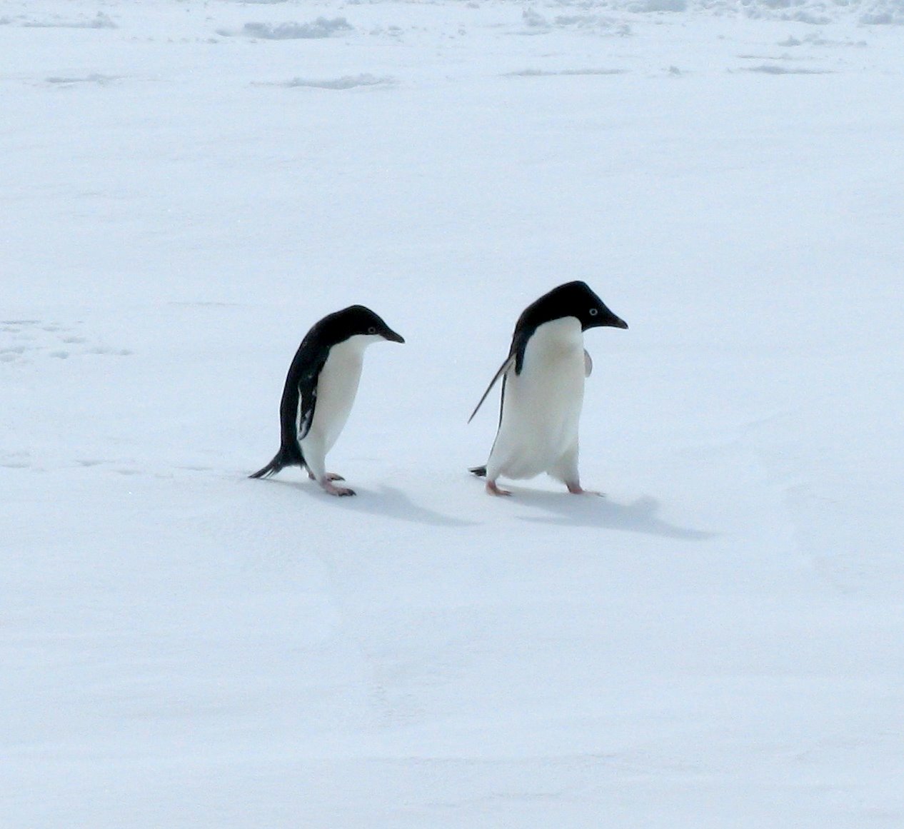 Two Adélie Penguins sneak up on a third just before he dives into the water. On the sea ice near the icebreaker Oden in the Amundsen Sea.