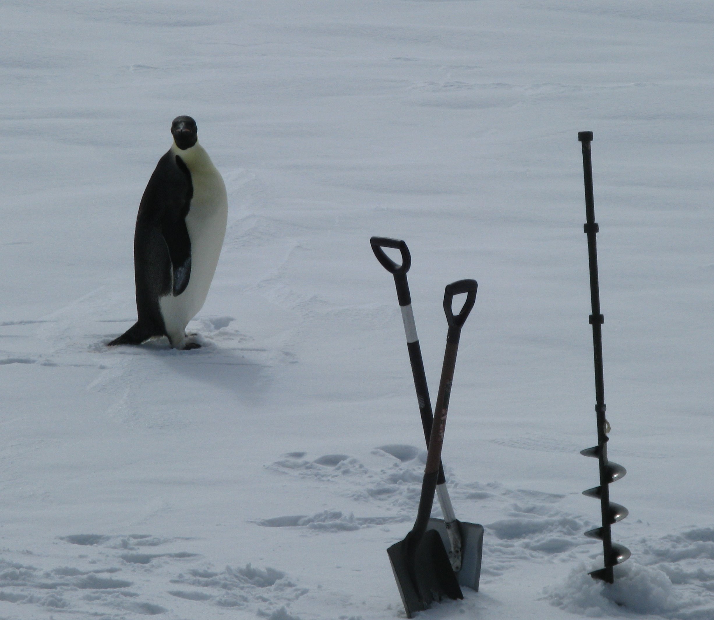 An Emperor Penguin looks at ice coring tools, wondering what they are. On the sea ice near the icebreaker Oden in the Amundsen Sea.