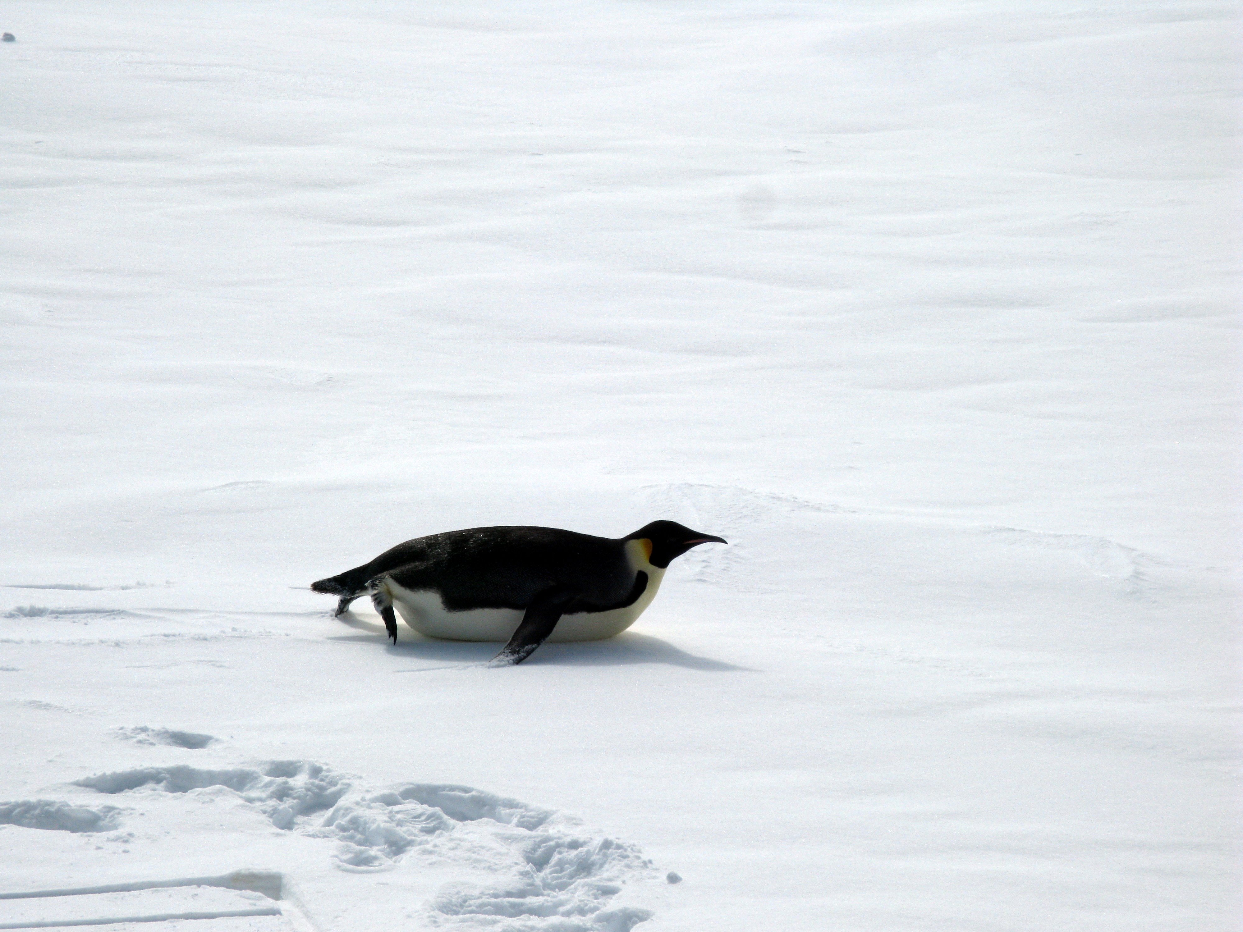 An Emperor Penguin glides away effortlessly on the ice. On the sea ice near the icebreaker Oden in the Amundsen Sea.