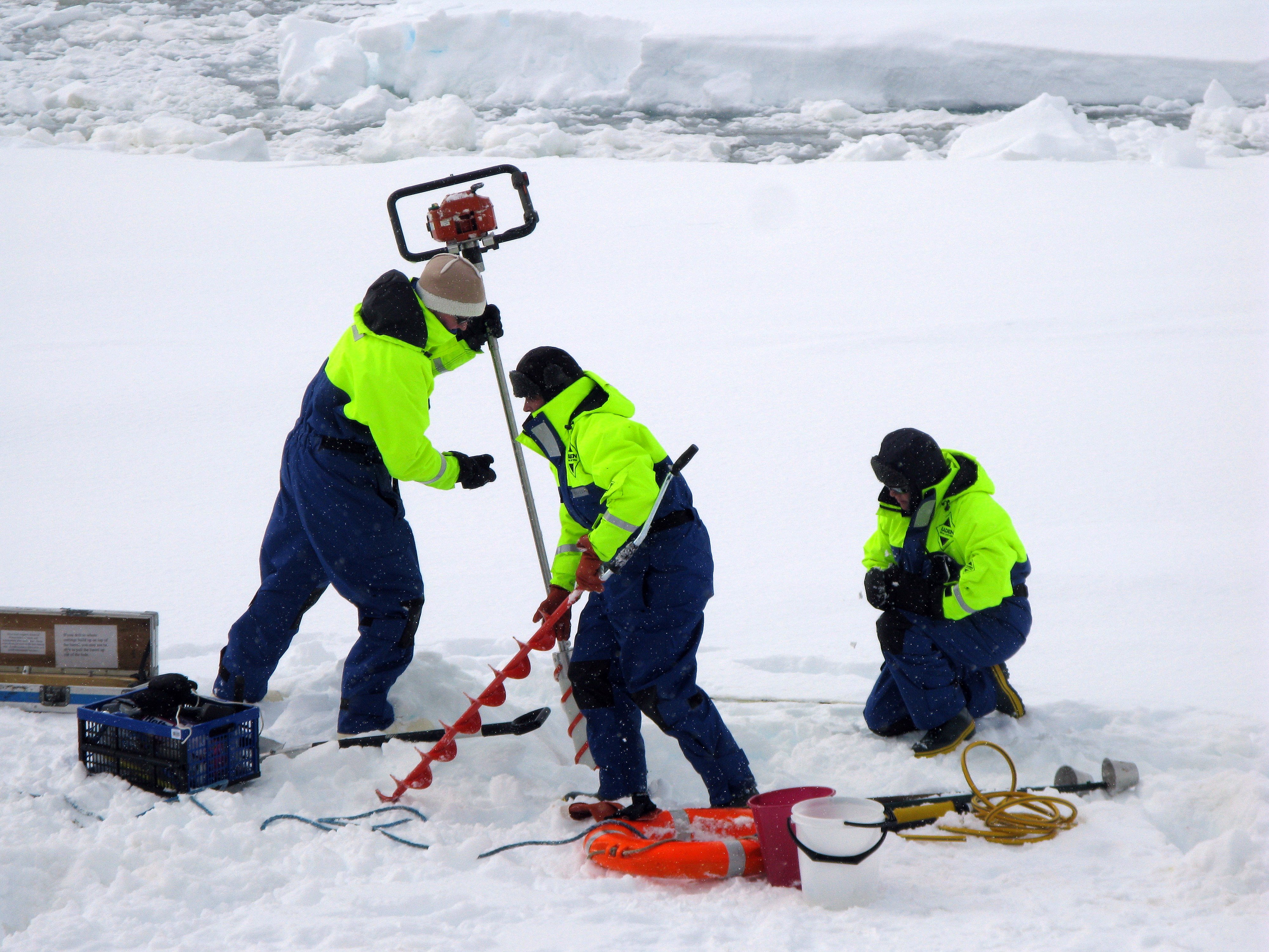 Researchers Rebecca Dickhut, Melissa Chierici, and Agneta Fransson prepare to drill into the ice. On the sea ice near the icebreaker Oden in the Bellingshausen Sea.