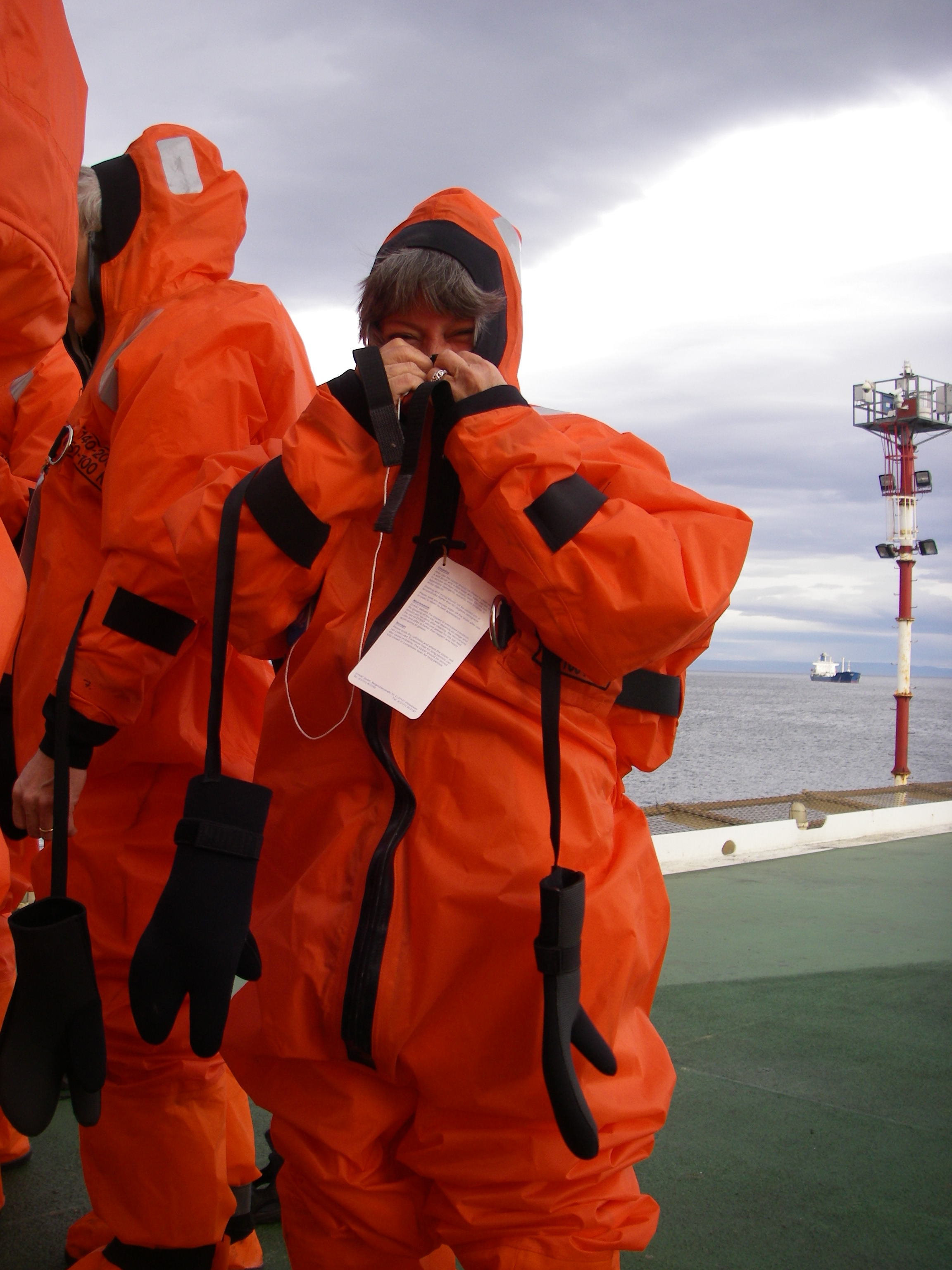 Lollie Garay zips her survival suit up to her nose. Aboard the icebreaker Oden in the Straits of Magellan.