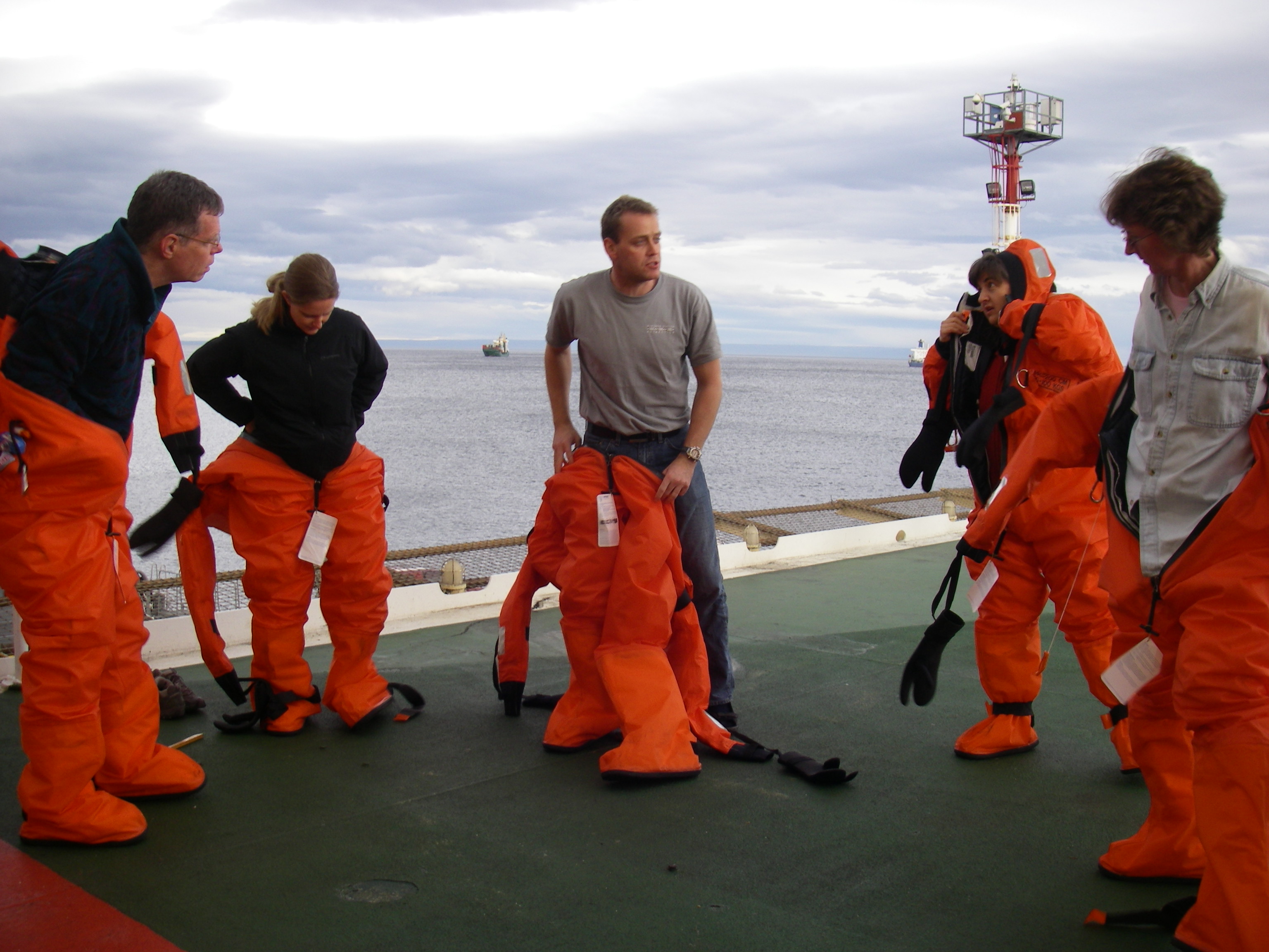 Safety Officer Thomas (center) explains the survival suit process to researchers. Left to right: Walker Smith, Kirsty Kemp, Tish Yager, and Rebecca Dickhut. Aboard the icebreaker Oden in the Straits of Magellan.