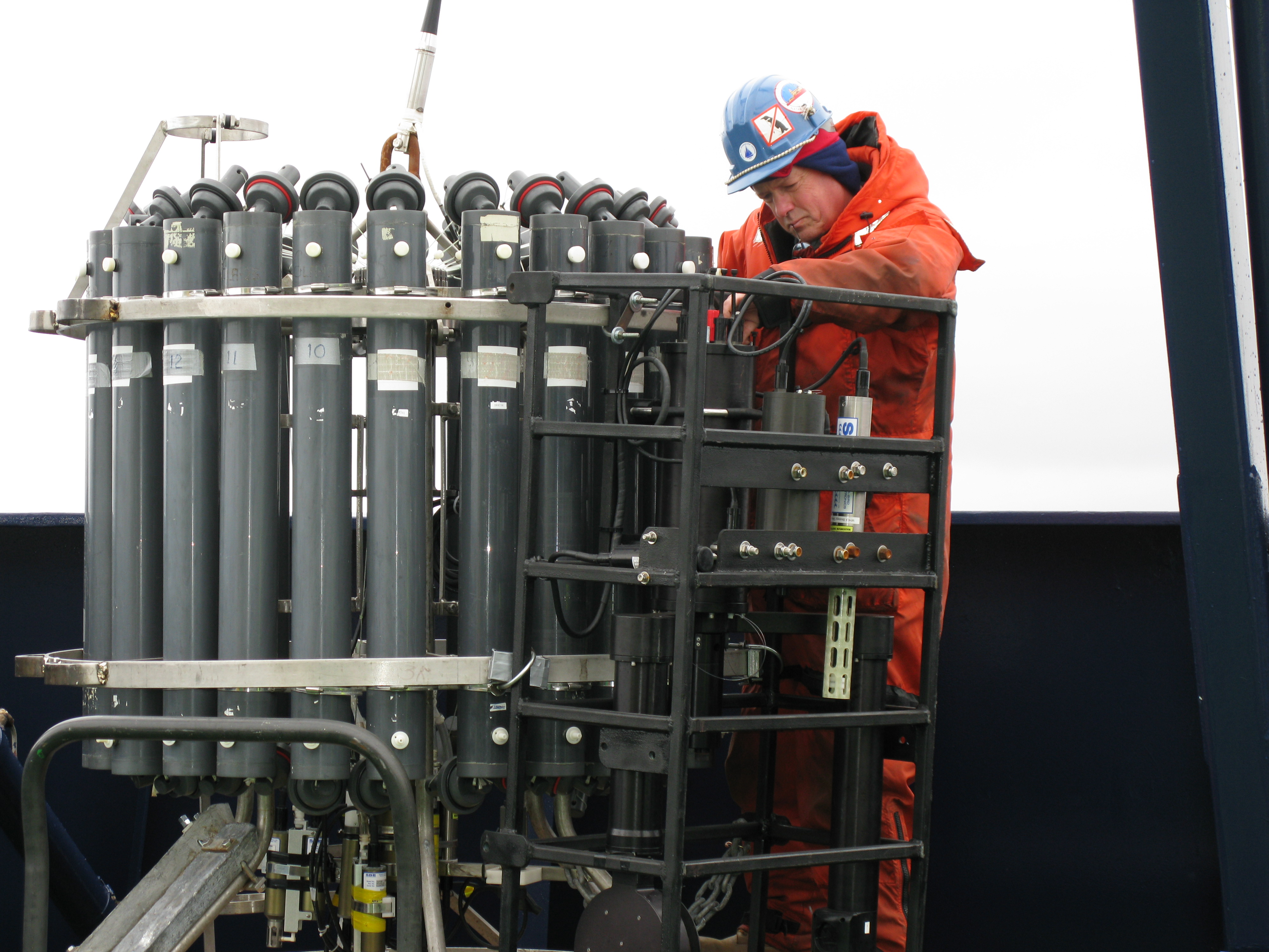 Researcher Mark Dennett checks the video recorder attached to the CTD (Conductivity, Temperature, Depth sensor) before it is cast. Aboard the icebreaker Oden near Deception Island, South Shetland Islands, in the Southern Ocean.