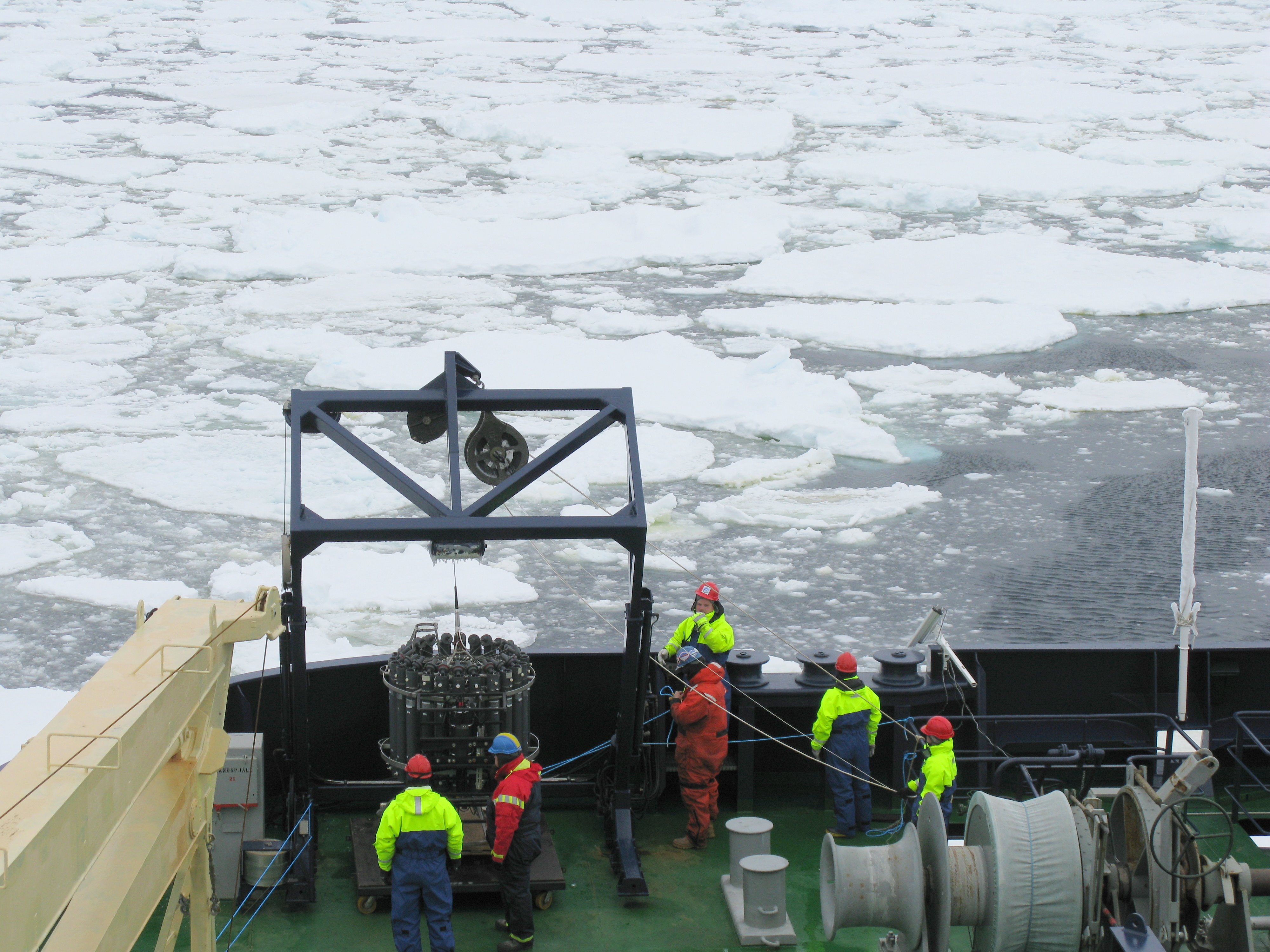 Researchers await the “go” before casting the CTD (Conductivity, Temperature, Depth sensor) into the frozen sea. Aboard the icebreaker Oden in the Bellingshausen Sea.