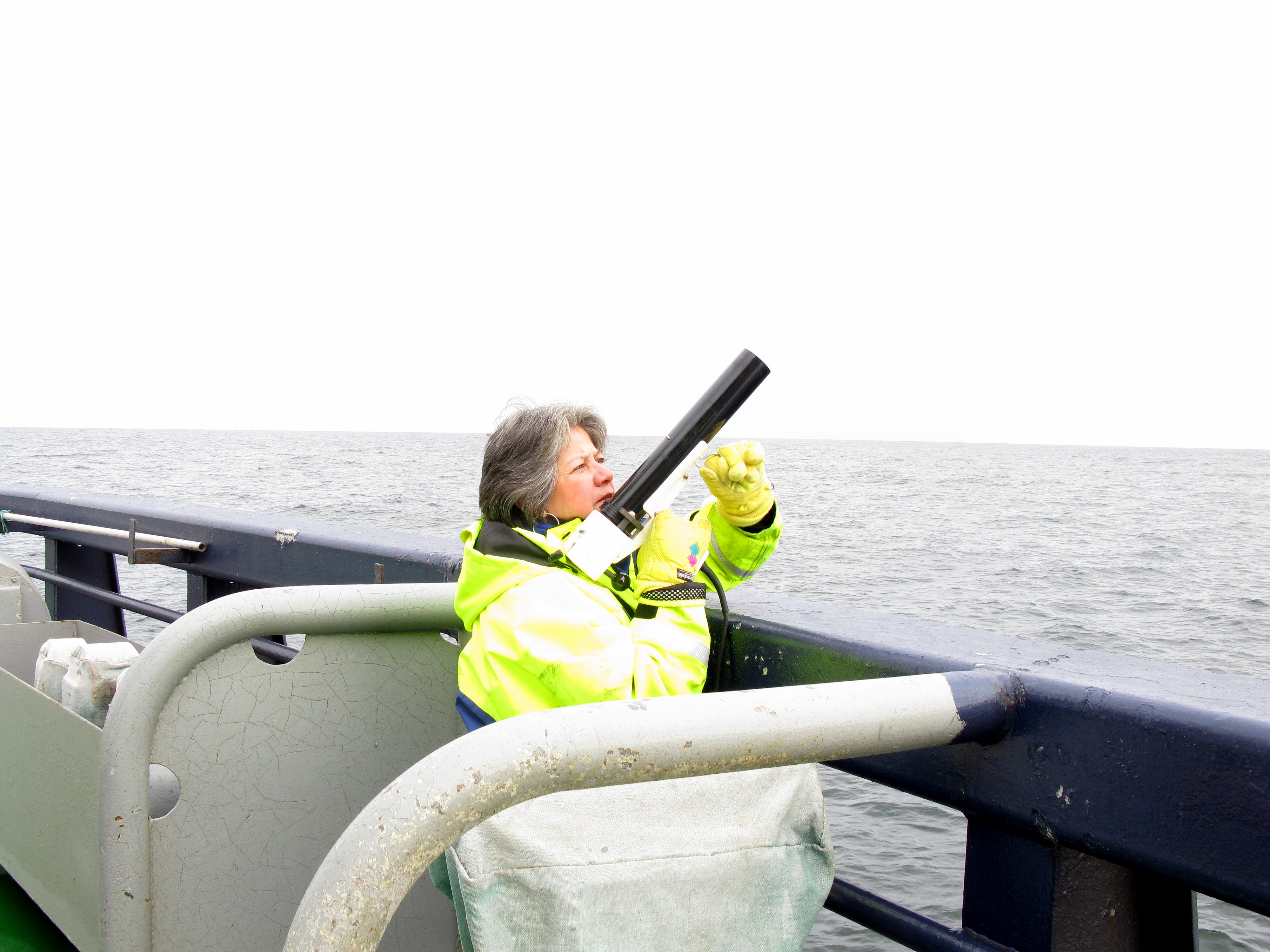 Lollie Garay aims, shoots, and tracks the XBT (Expendable Bathythermograph probe) on the portside of the Oden. Aboard the icebreaker Oden in the Ross Sea.