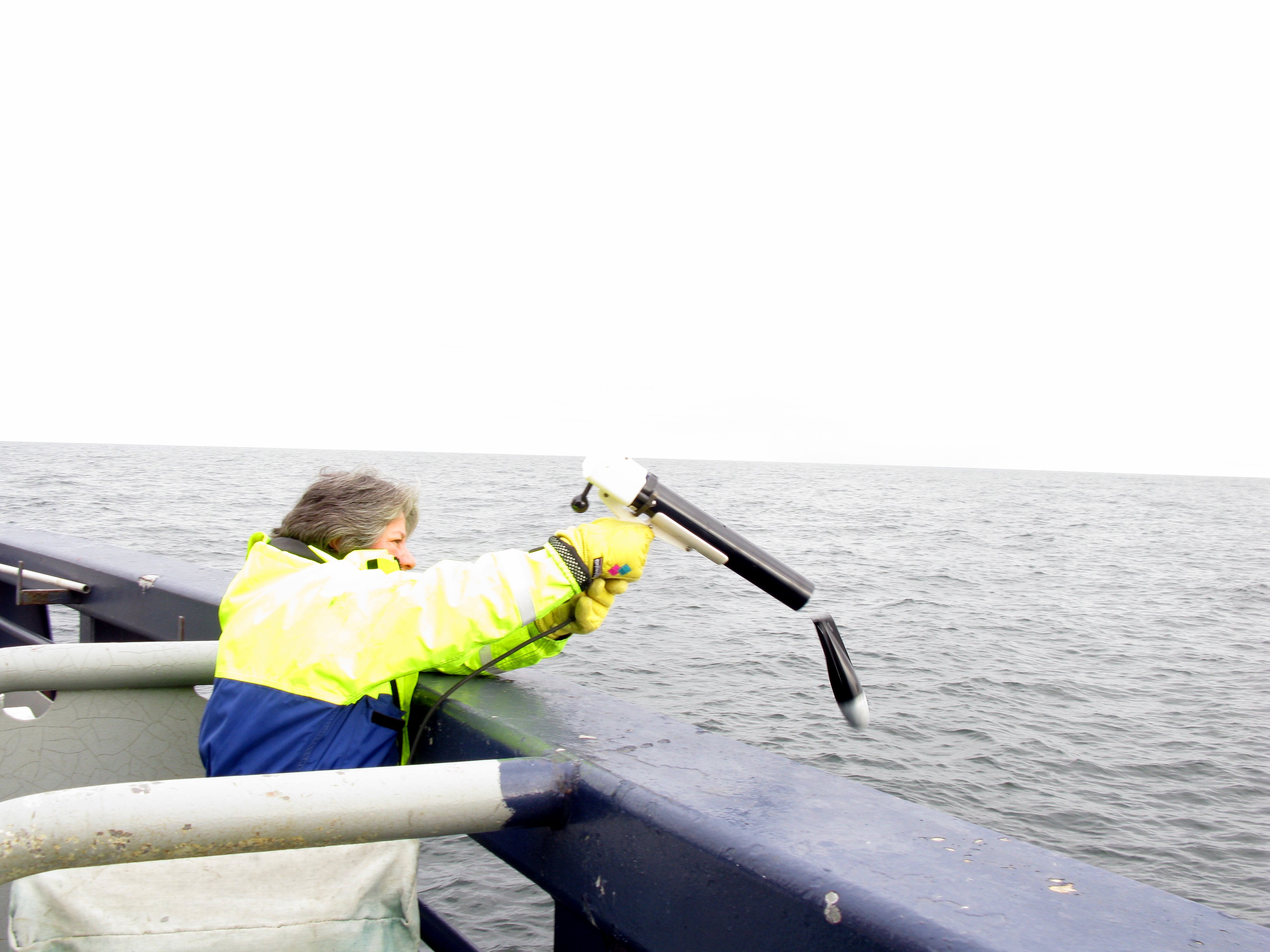 Lollie aims, shoots, and tracks the XBT (Expendable Bathythermograph probe) on the portside of the Oden. Aboard the icebreaker Oden in the Ross Sea.