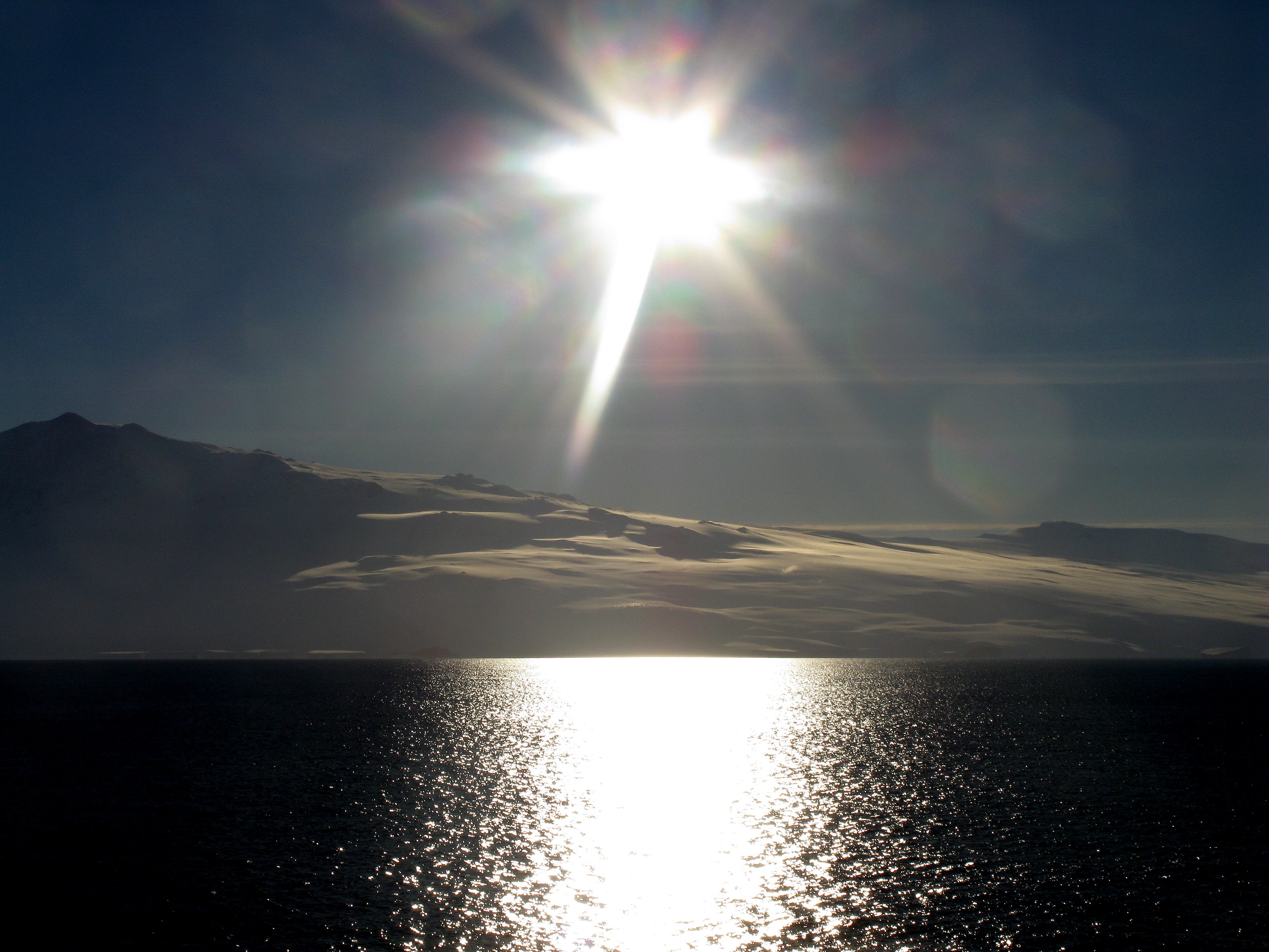 The sun casts a soft glow over Ross Island, seen through a filtered window of the Oden. Aboard the icebreaker Oden in the Ross Sea, looking at Ross Island, Antarctica.