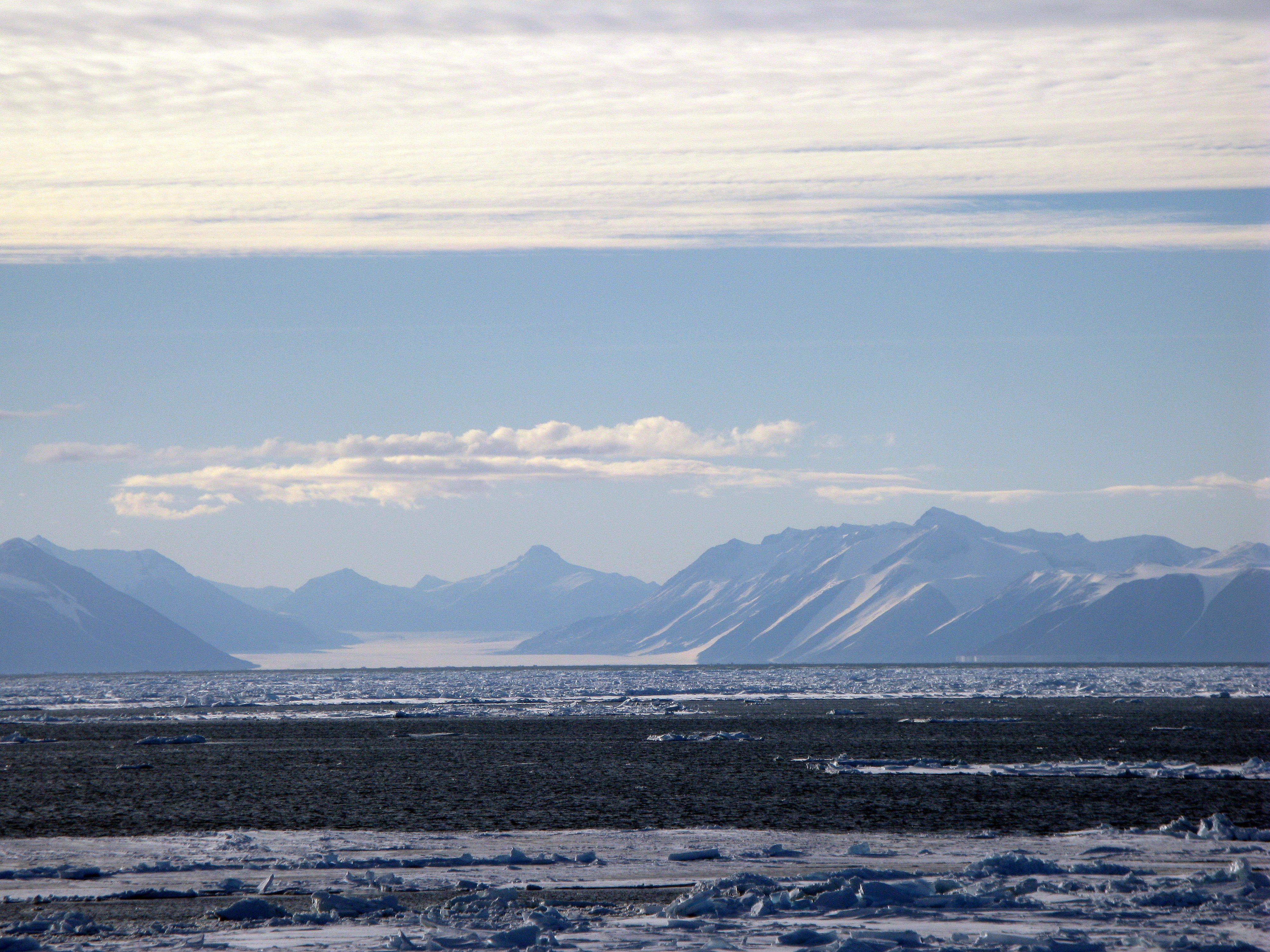 The Oden faces Ross Island from the sea. Aboard the icebreaker Oden in the Ross Sea, looking at Ross Island, Antarctica.