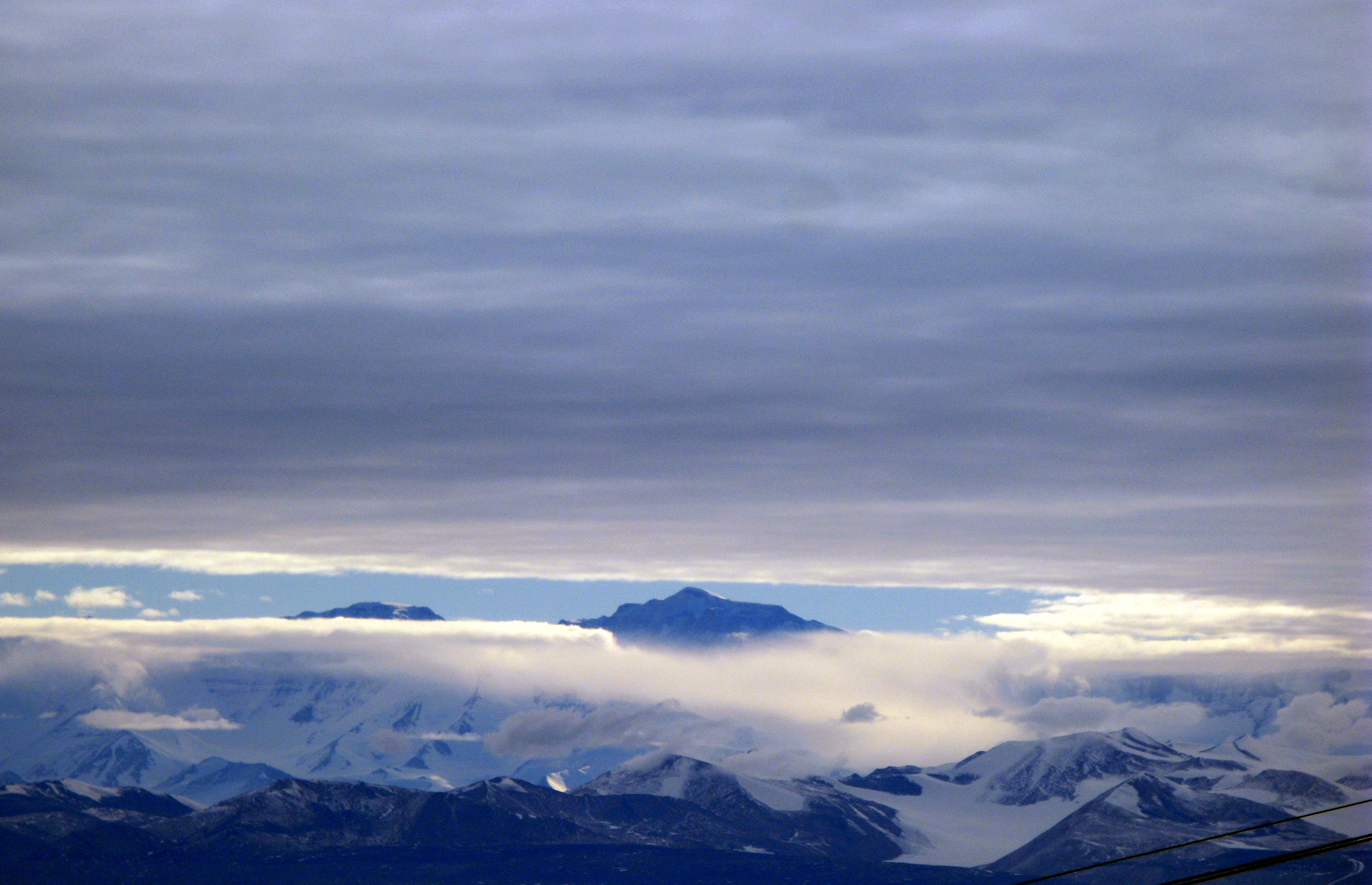 A view of Mt. Erebus from the helicopter, flying over McMurdo Sound.
