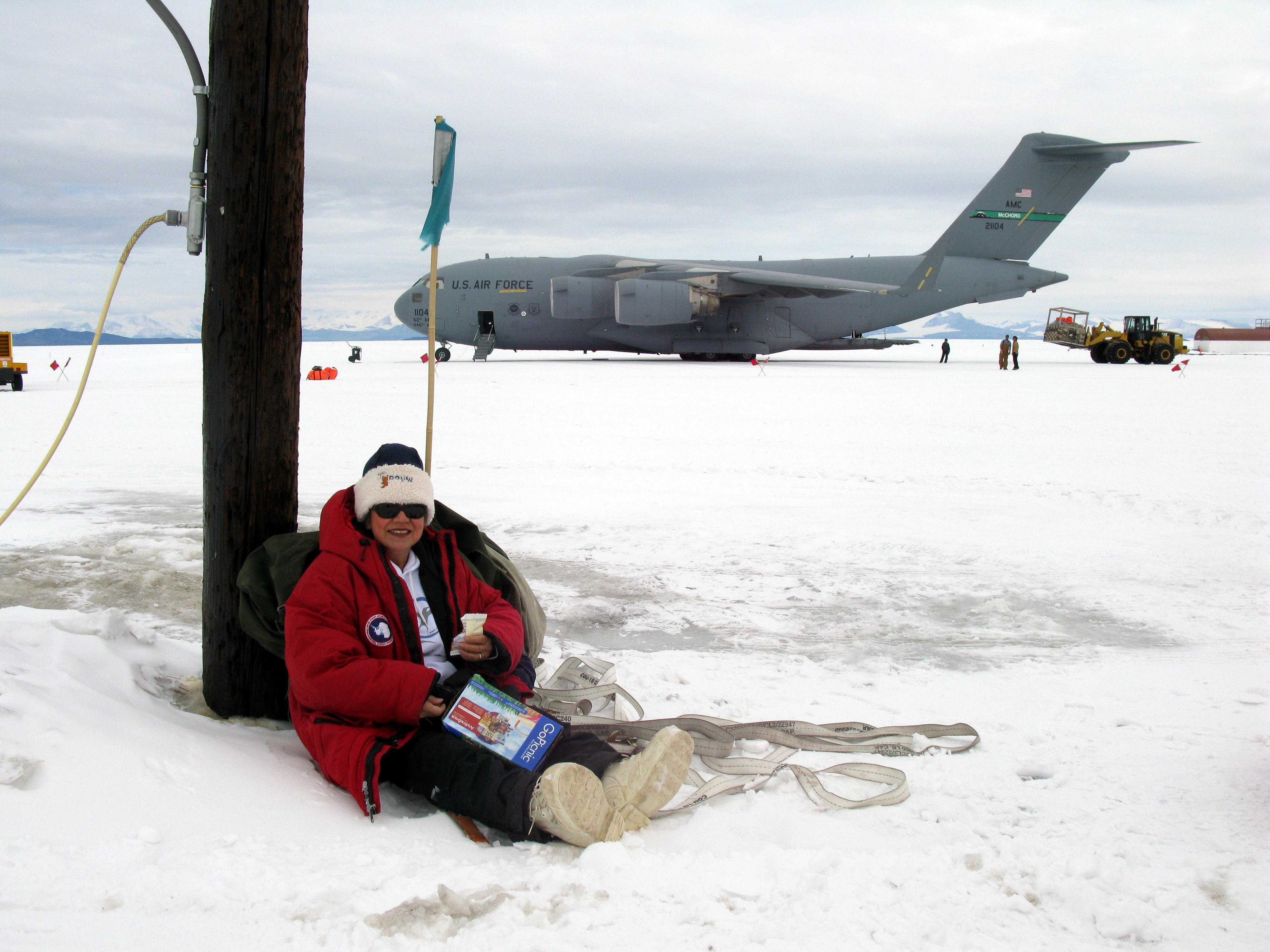 Lollie Garay finds a comfy spot to sit while she waits to board the C-130 Hercules at Pegasus Field airstrip, Antarctica.