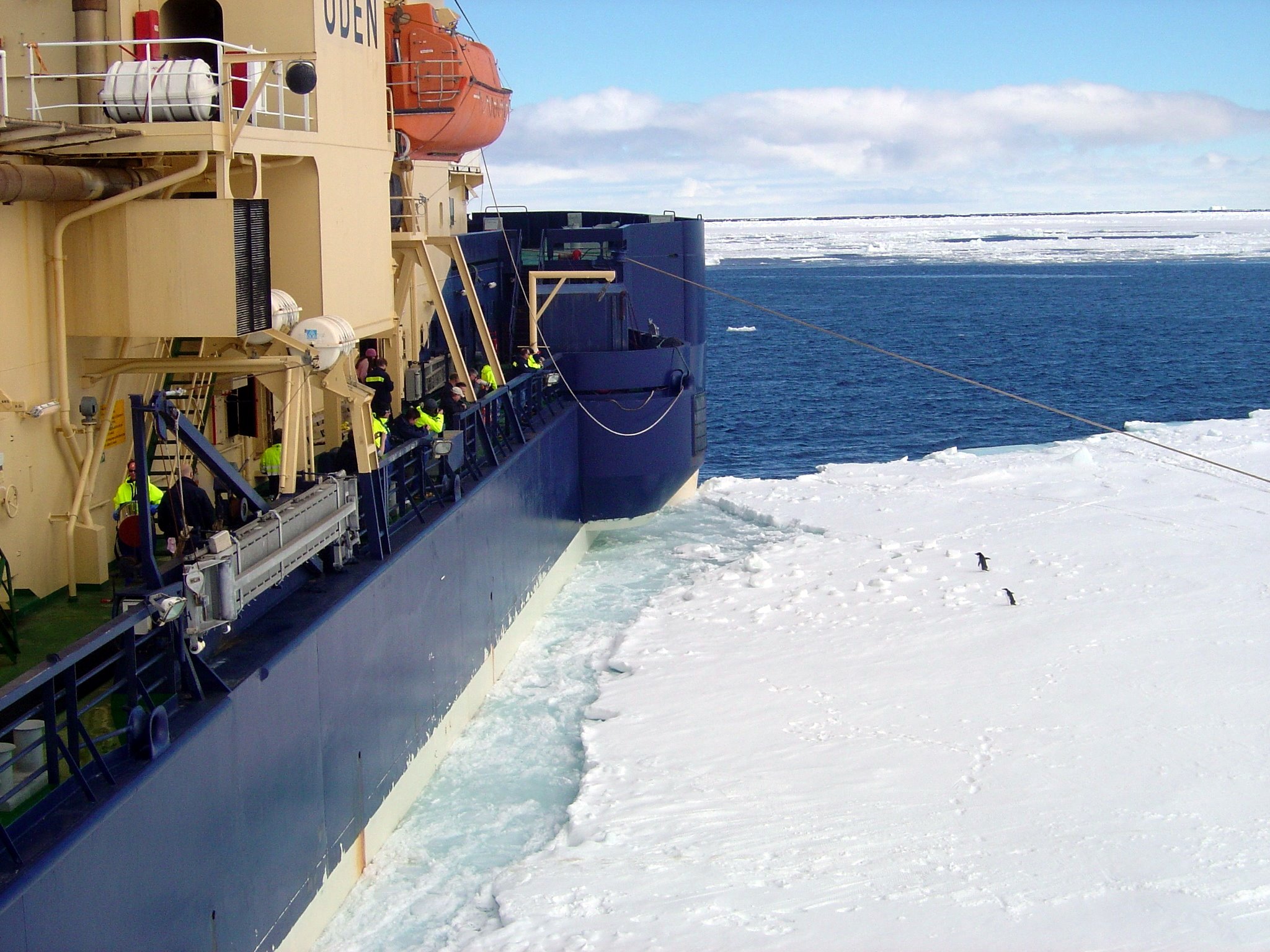 "Wait! Don’t go!" Adélie Penguins run alongside the Oden as it moves away from the ice floe. On the sea ice of the Bellingshausen Sea.