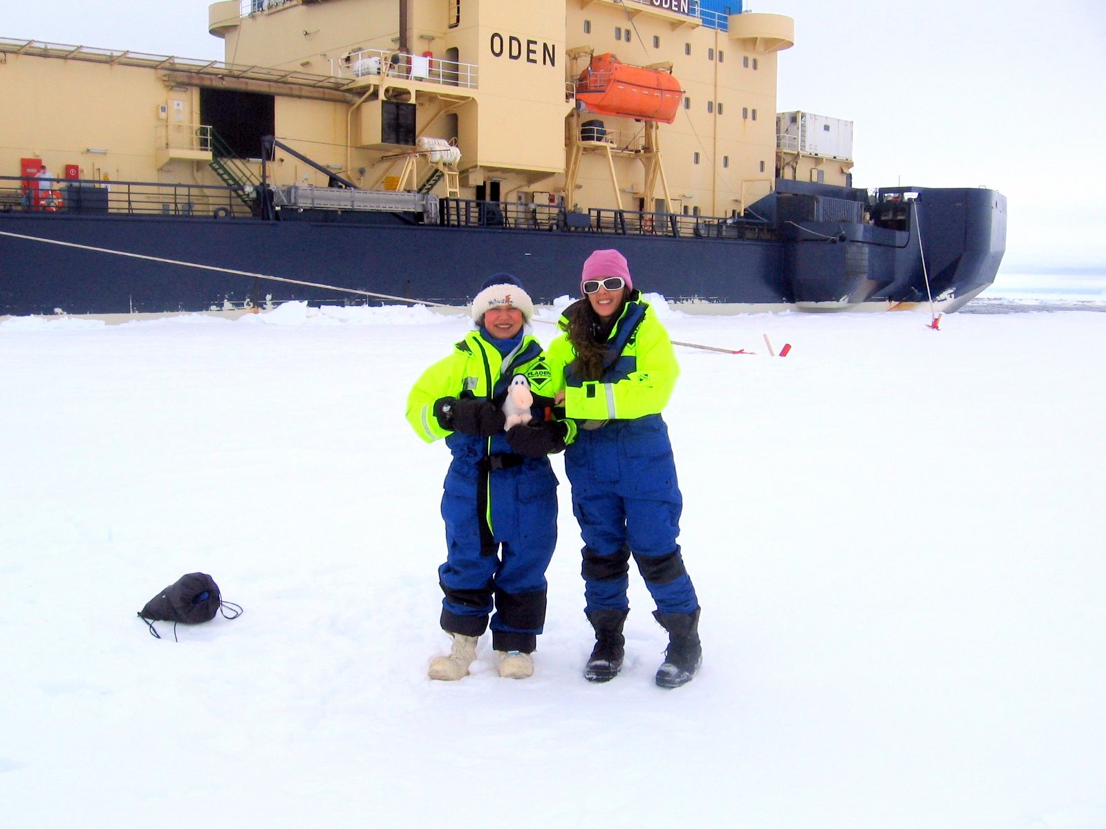 Lollie Garay, Opus, and grad student Glaucia Fragoso pose in front of the icebreaker Oden during ice liberty. On the sea ice of the Amundsen Sea.