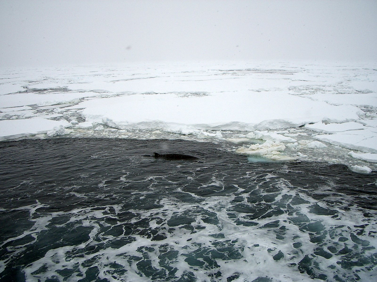 A minke whale surfaces and follows the Oden for a while. Aboard the icebreaker Oden in the Bellingshausen Sea.