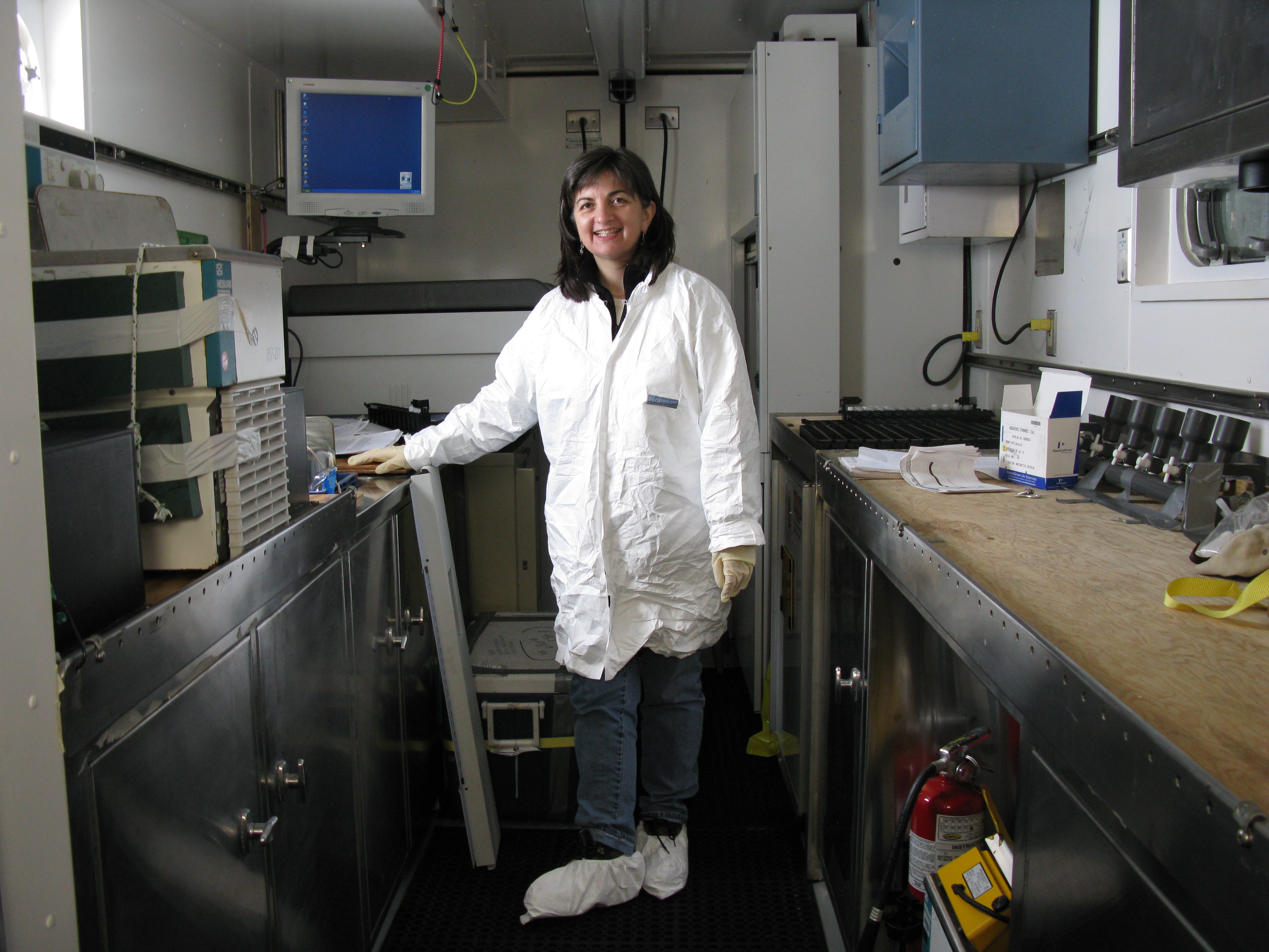 Researcher Tish Yager explains the work she will do in the "Rad (radiation) Van." as she sets it up. Aboard the icebreaker Oden in the Bellingshausen Sea.
