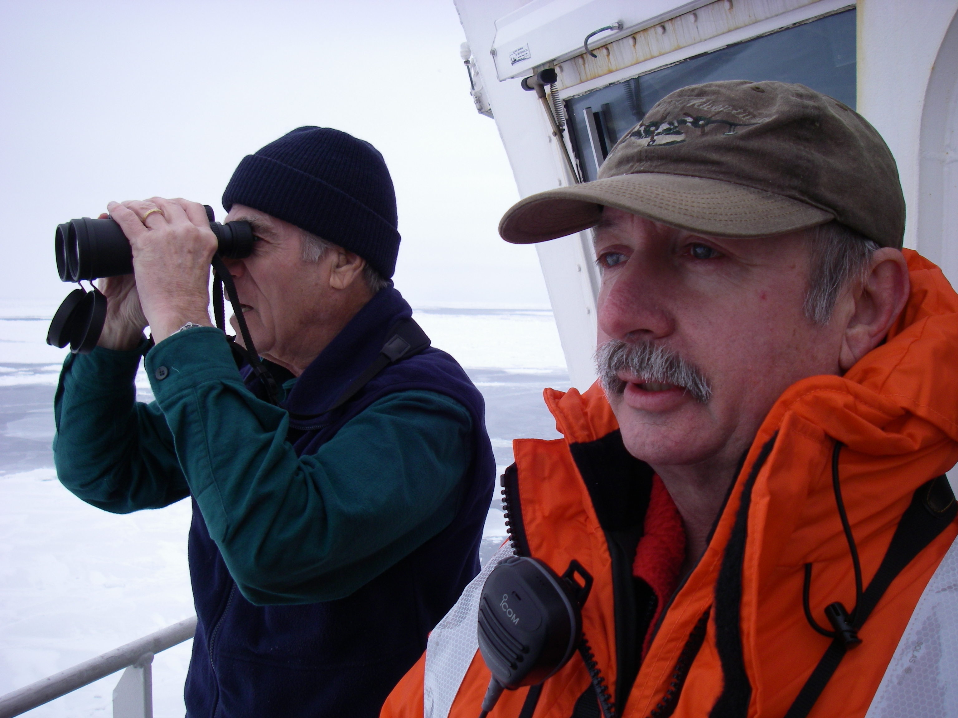 Carlton Ray and Dave watching seal tagging off of the USCGC Healy icebreaker, on the Bering Sea.