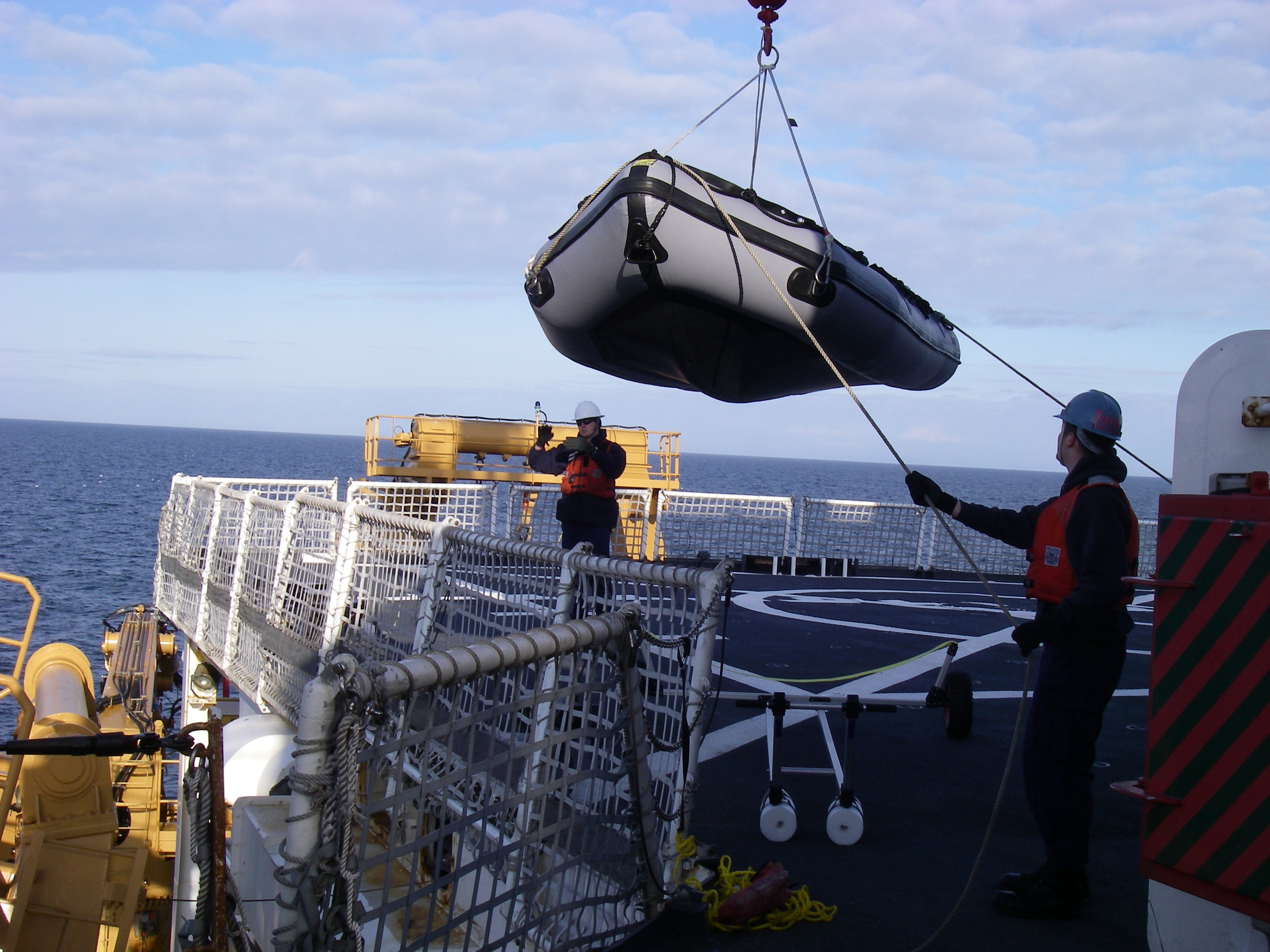 Launching the zodiac for the first time. On the USCGC Healy icebreaker, on the Bering Sea.