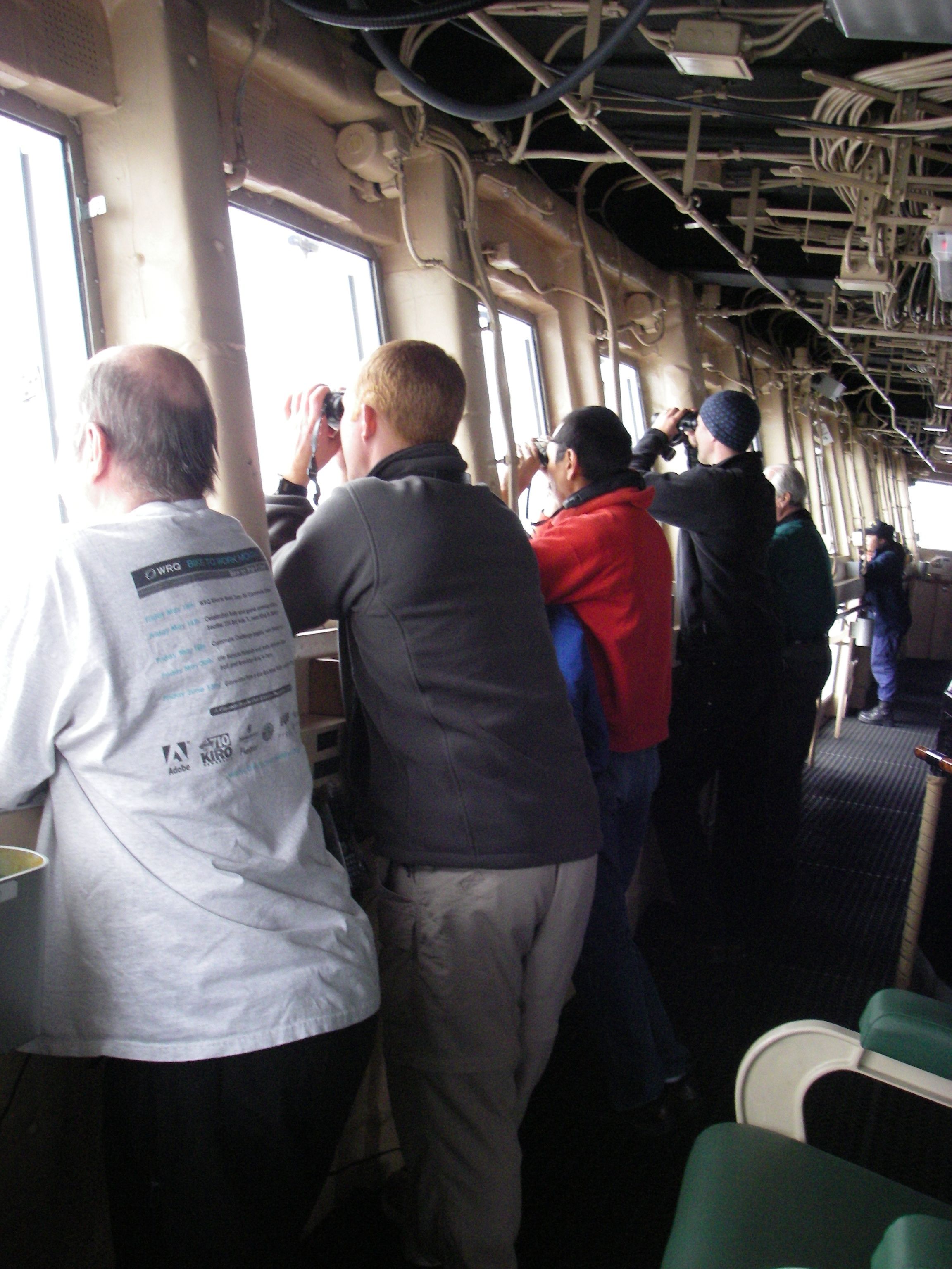 The seal team watches from the bridge. On the USCGC Healy icebreaker, on the Bering Sea.