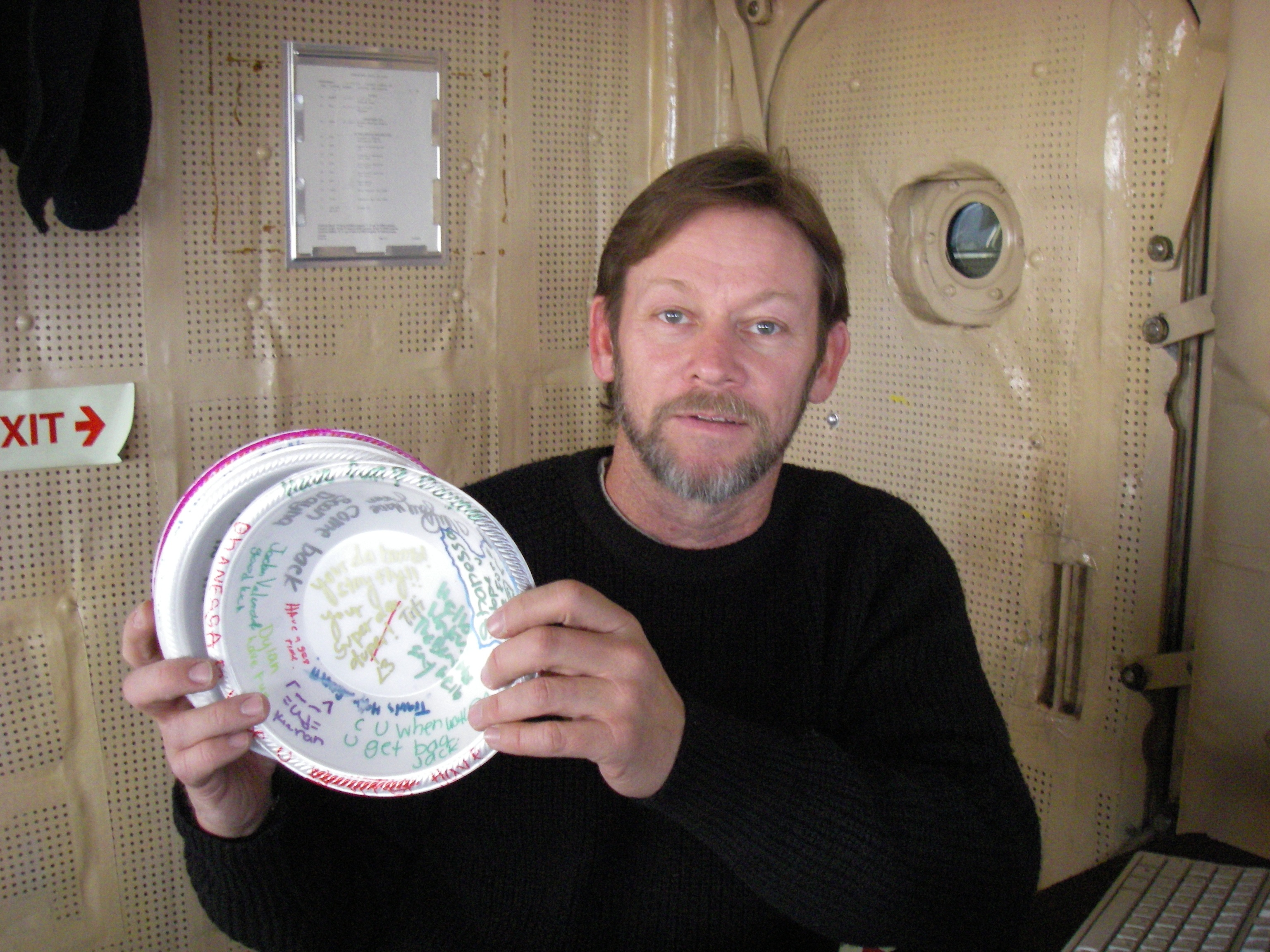 Scott Hiller and some styrofoam before it goes down. On the USCGC Healy icebreaker, on the Bering Sea.