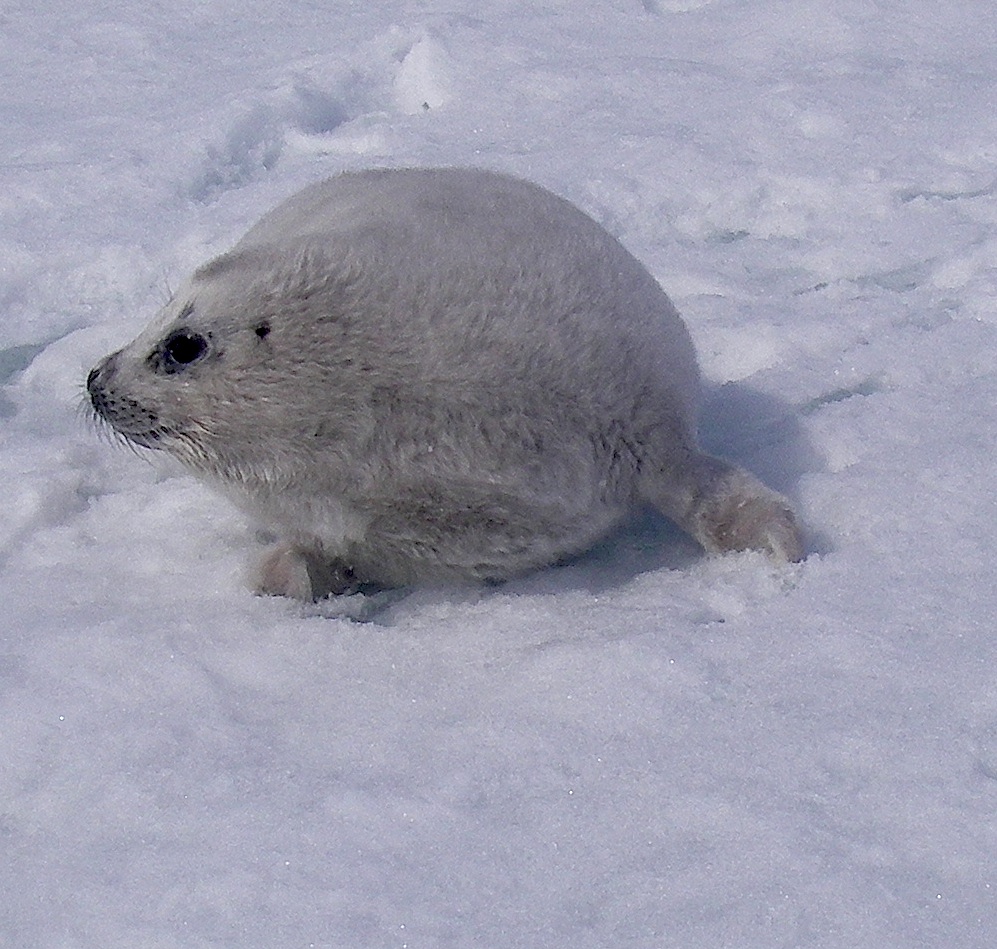 Side view of a baby spotted seal. On the sea ice, near the USCGC Healy icebreaker on the Bering Sea.